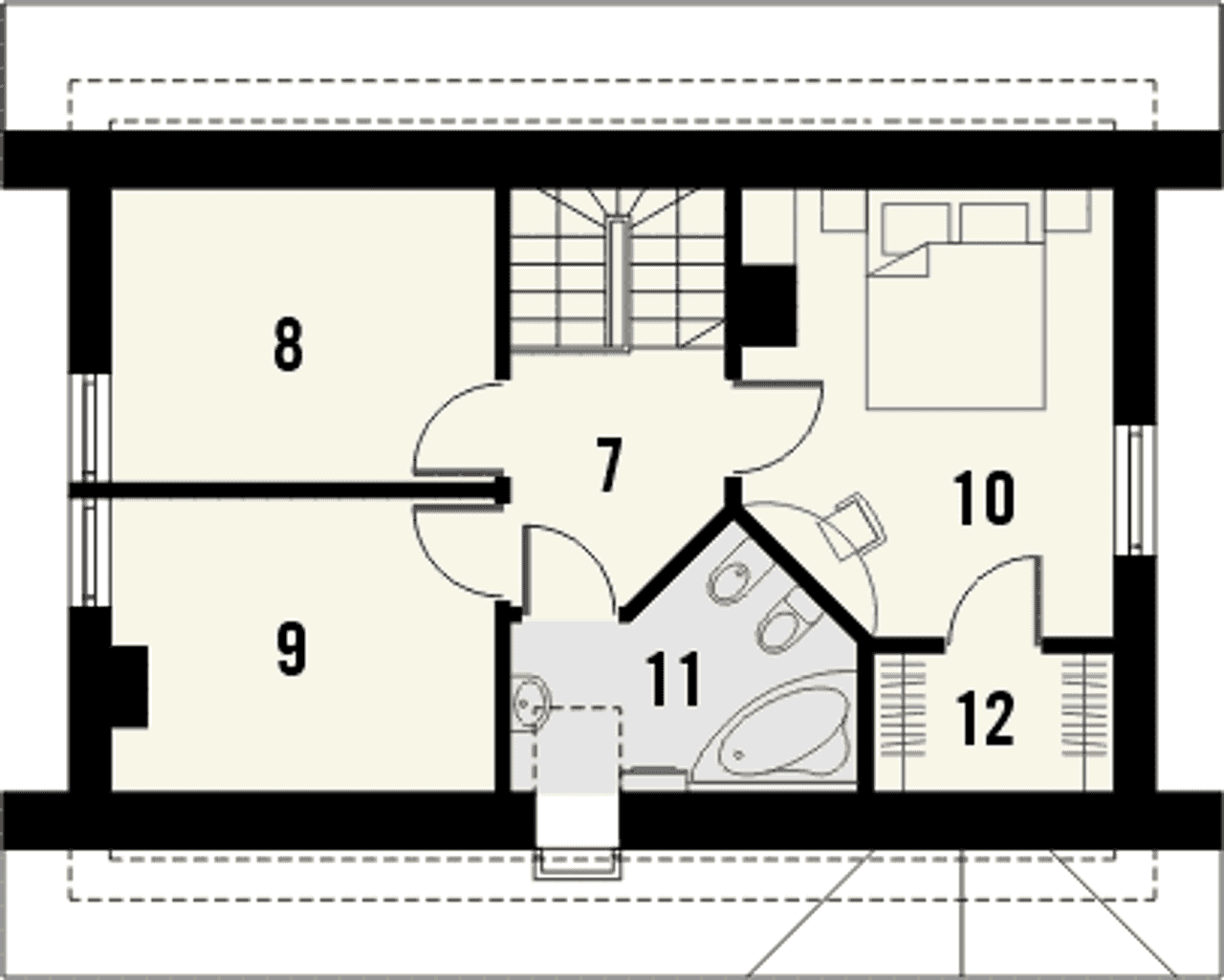Dodatkowy pokój przy strefie wejściowej sąsiaduje z łazienką i pomieszczeniem gospodarczym. Poddasze zawiera trzy sypialnie, garderobę dostępną z jednego z pokoi oraz łazienkę z wejściem od korytarza.