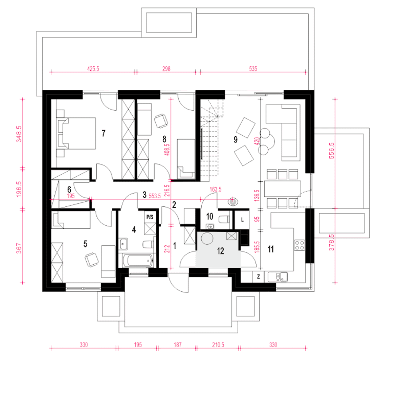 Wypełnij formularz i otrzymaj rysunki w pdf z dokładnymi wymiarami budynku i pomieszczeń (długość, szerokość, wysokość) dla projektu Bratek III bez garażu B
