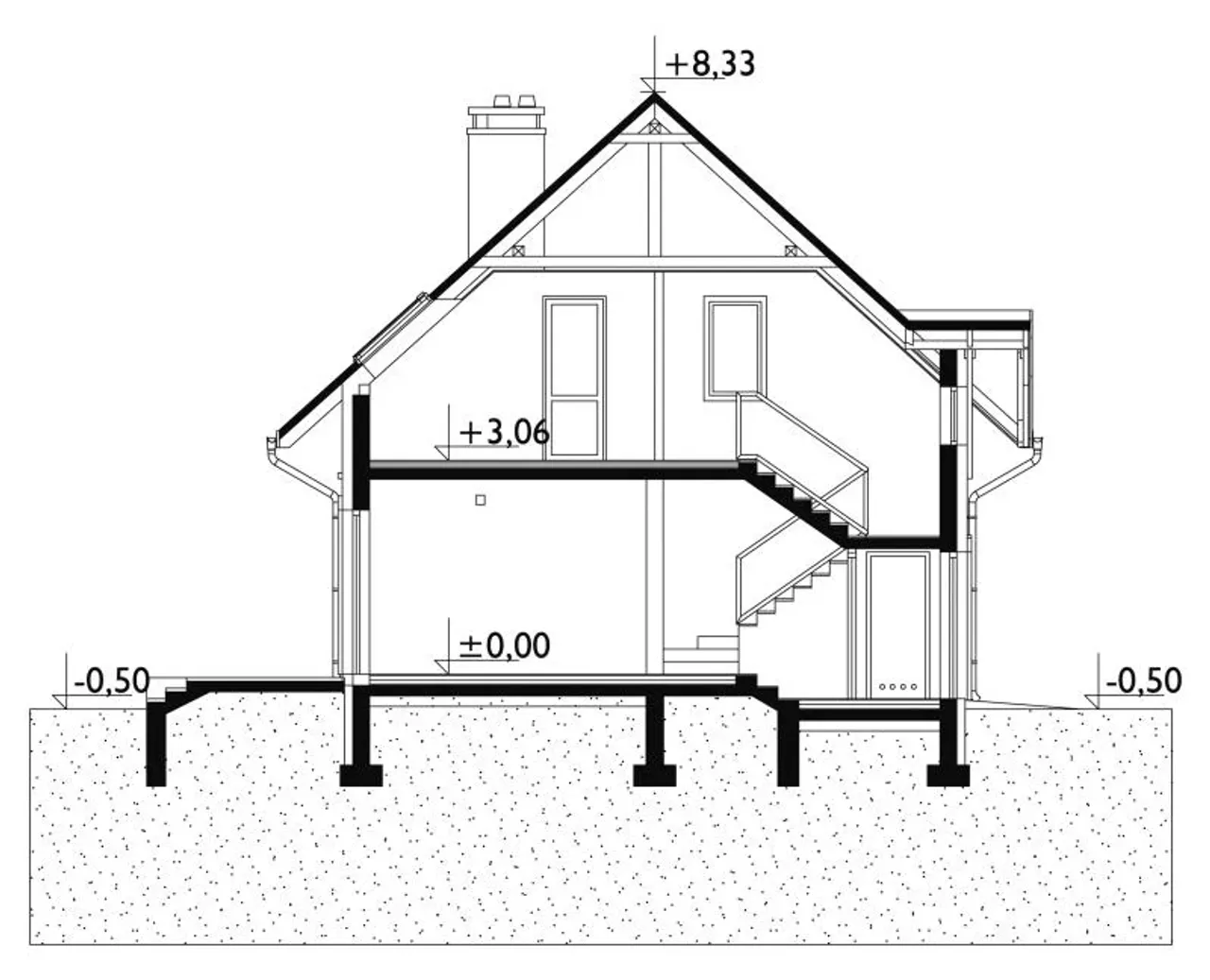 - przekroje - pokazują wszystkie elementy budynku po przecięciu go wzdłuż lub w poprzek od dachu do fundamentów tj. warstwy podłogi, stropów i dachu