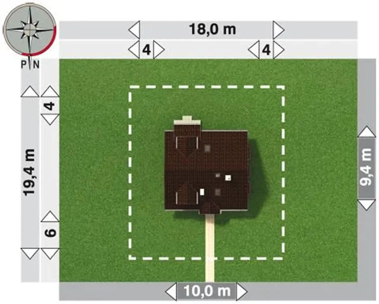 - rzut dachu - ukazuje jego kształt, wymiary, kąt nachylenia połaci, rozmieszczenie okien połaciowych, lukarn, świetlików i rur spustowych, pokazuje rozmieszczenie kominów i informuje o sposobie odwodnienia: rozmieszczeniu i rozmiarach rynien