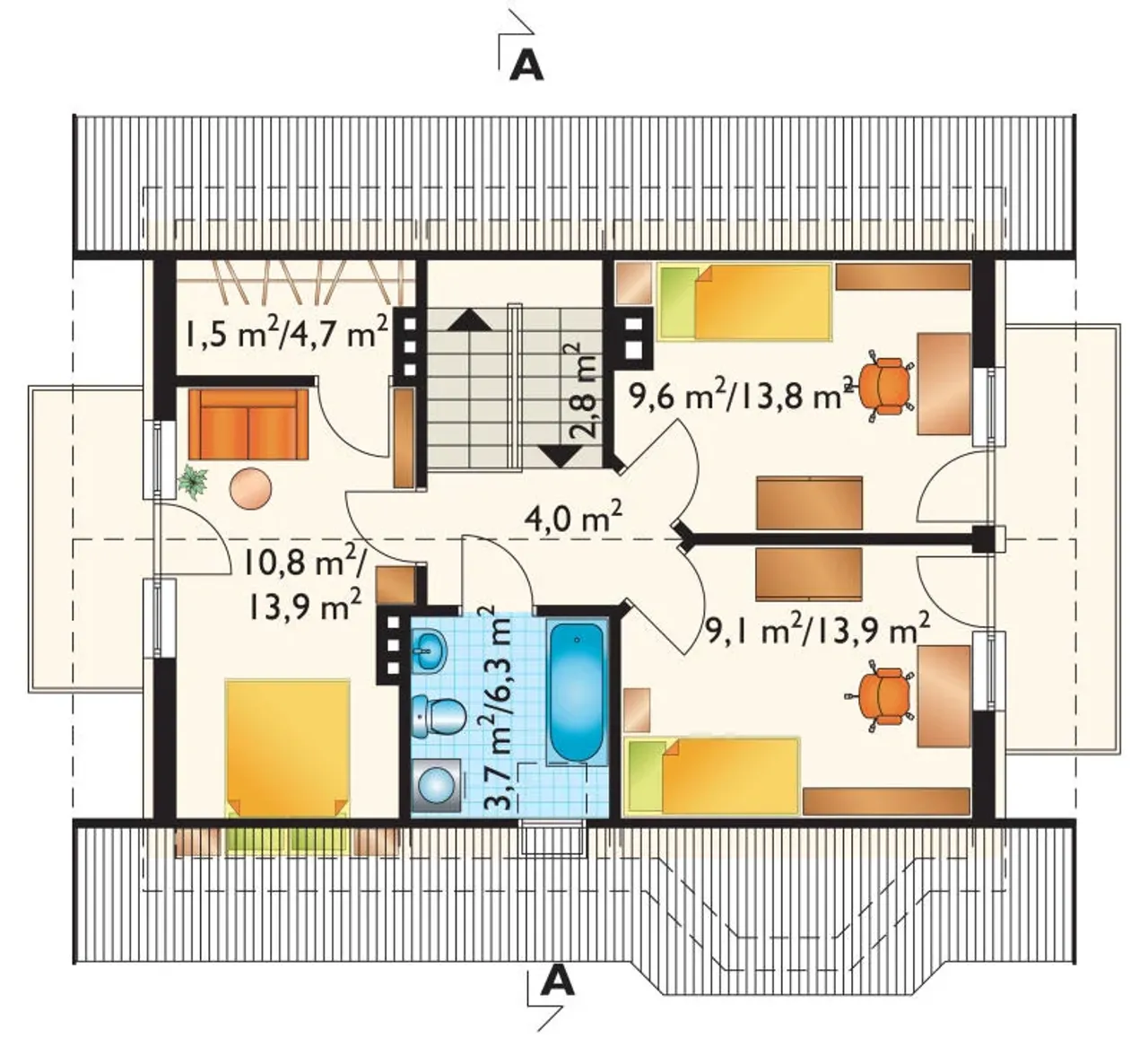 - rzut dachu - ukazuje jego kształt, wymiary, kąt nachylenia połaci, rozmieszczenie okien połaciowych, lukarn, świetlików i rur spustowych, pokazuje rozmieszczenie kominów i informuje o sposobie odwodnienia: rozmieszczeniu i rozmiarach rynien