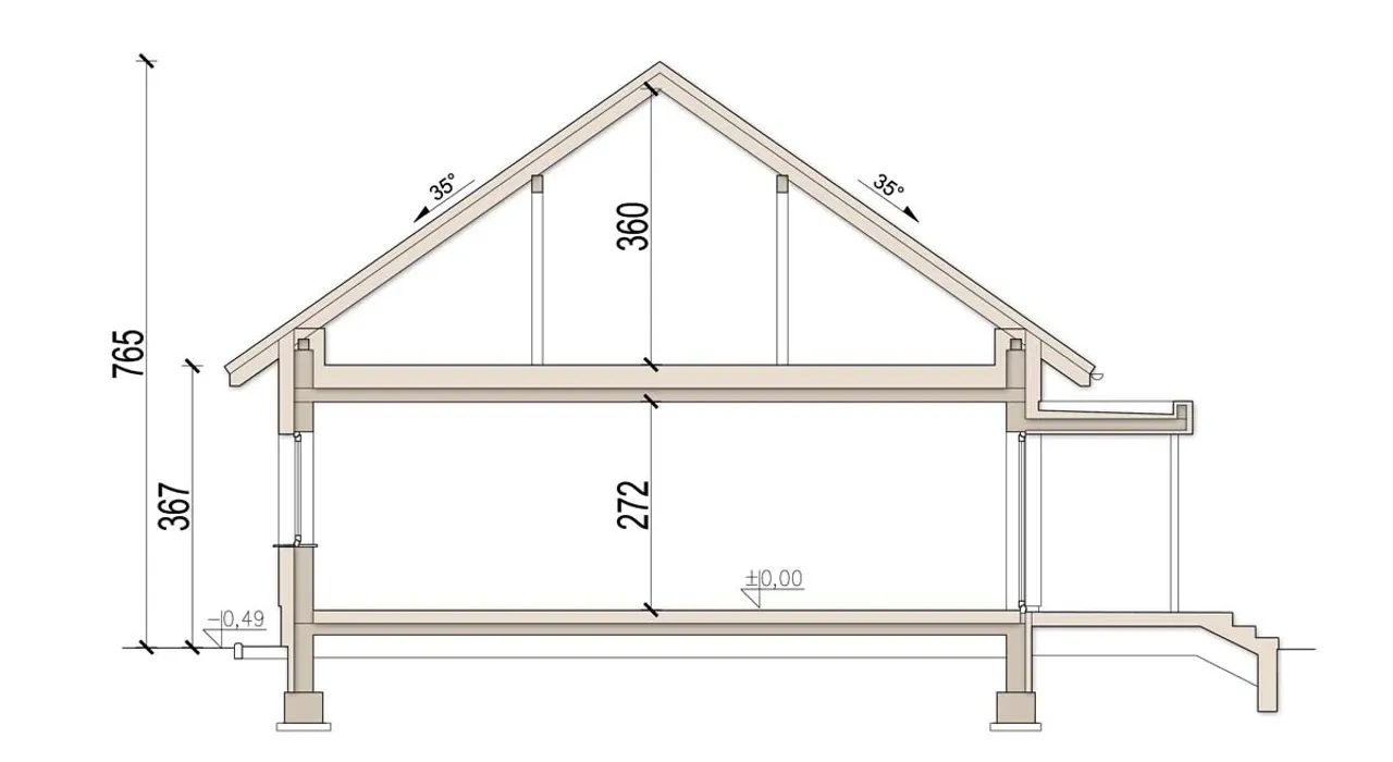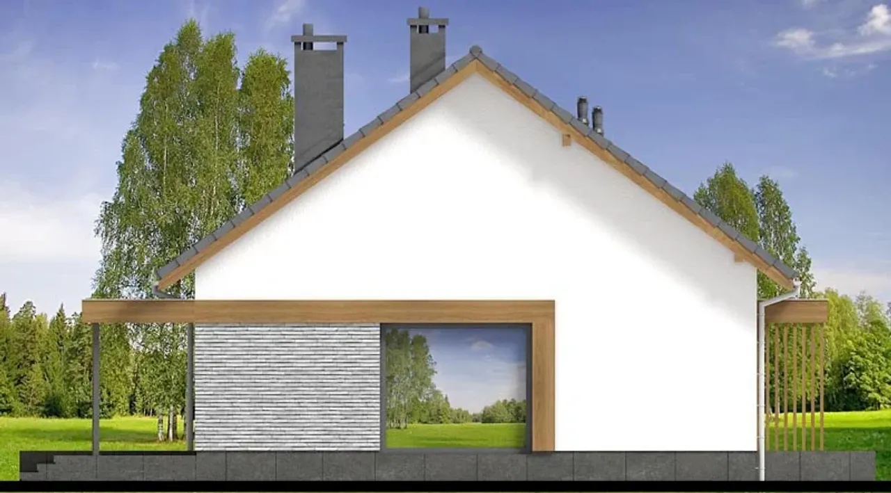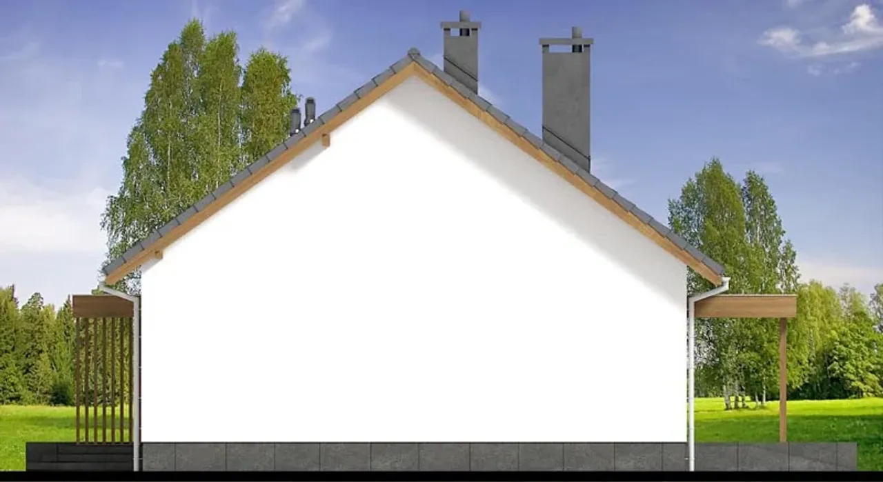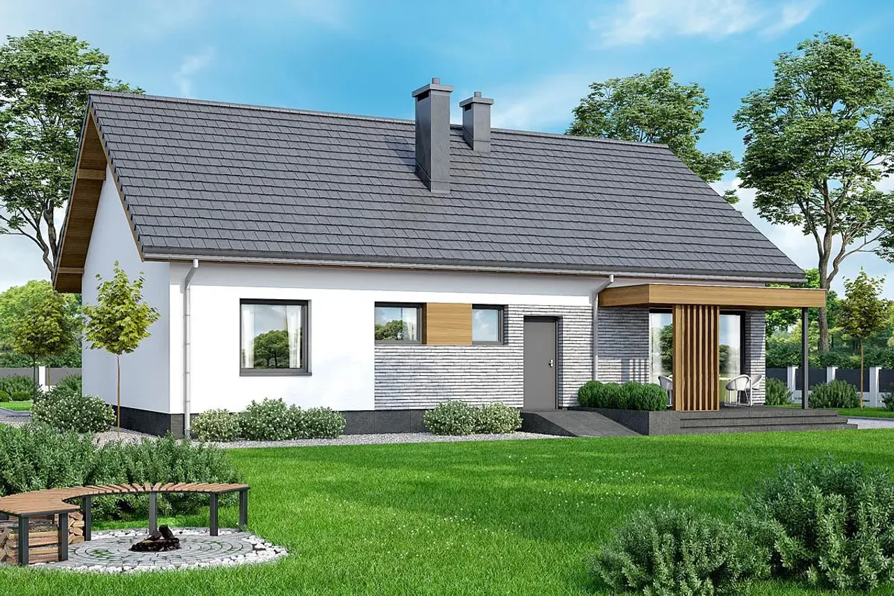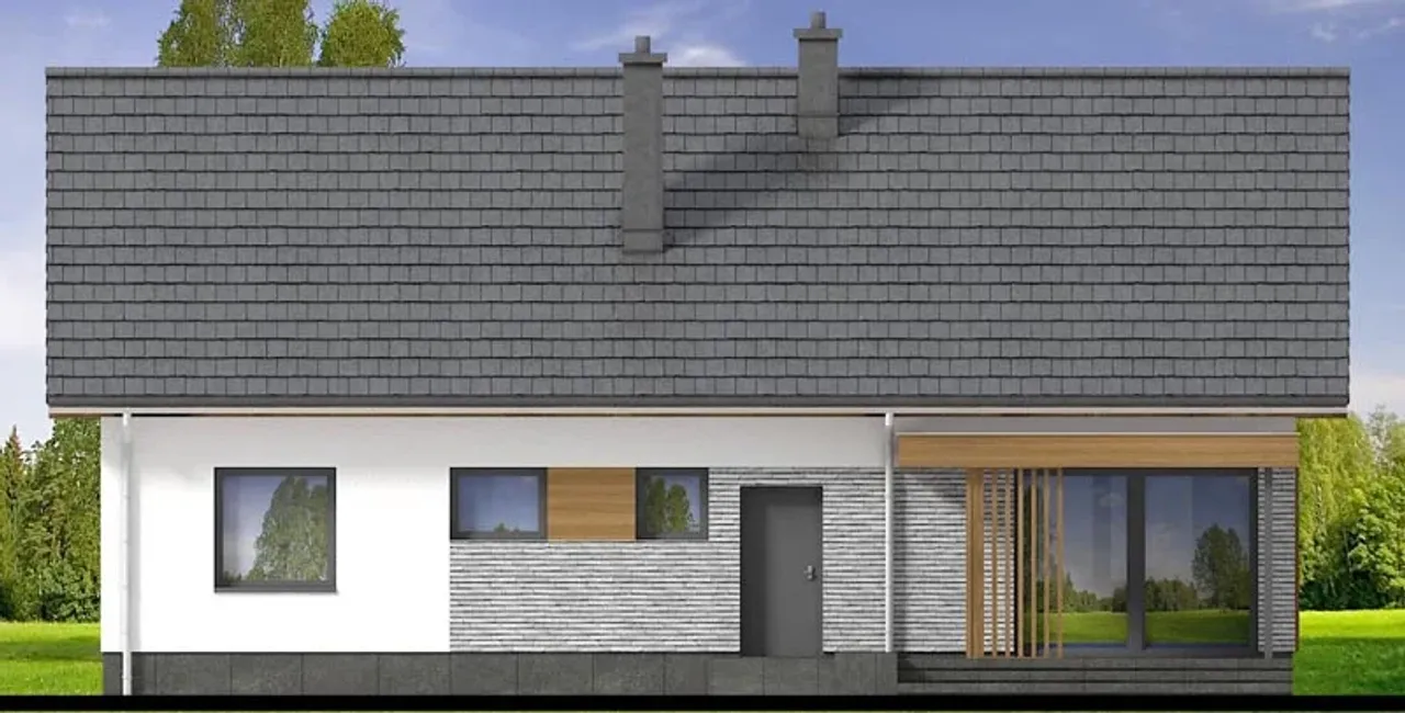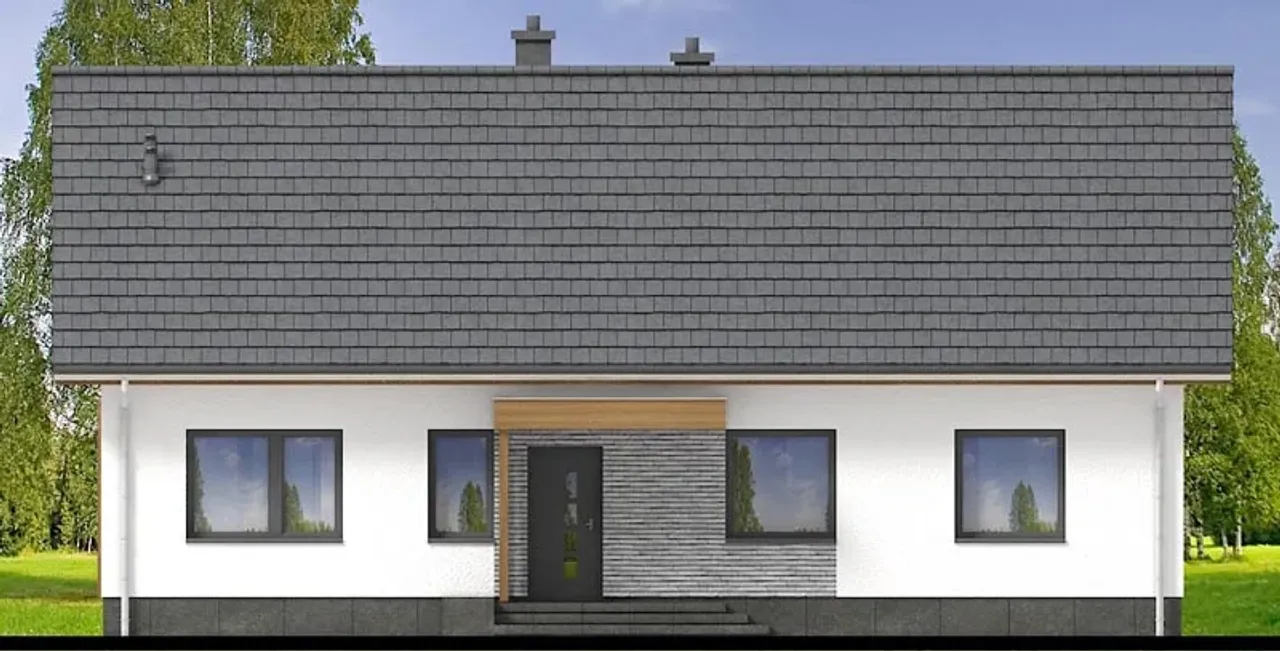 Dwuspadowy dach o łagodnym spadku, położony równolegle do drogi, idealnie wpisuje się w aktualne trendy architektoniczne i ułatwia lokalizację domu na większości działek. Trwałe żelbetowe fundamenty oraz ściany z pustaków ceramicznych gwarantują ciszę, stabilność i odporność na zmiany pogody. Obecność kominka w projekcie pozwala na stworzenie wyjątkowej, klimatycznej strefy wypoczynku, a nowoczesna forma budynku świetnie prezentuje się w otoczeniu zieleni.