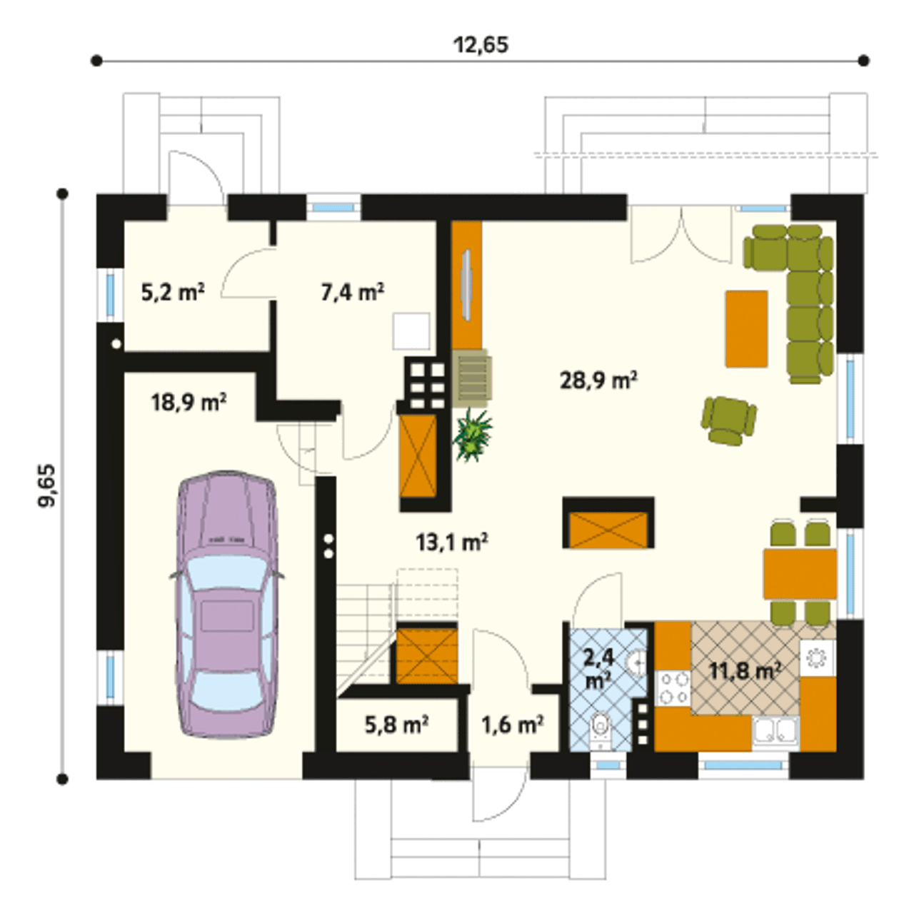 Gotowy projekt domu jednorodzinnego Carmen (CE) przedstawia budynek parterowy z poddaszem użytkowym, zaprojektowany w technologii murowanej. Dom będzie przykryty dachem dwuspadowym o kącie nachylenia 40 stopni/e. W domu na podstawie projektu Carmen (CE) możliwe jest zastosowanie ogrzewania na paliwo stałe lub gazowego, i dogrzewanie domu kominkiem. W projekcie znajduje się garaż jednostanowiskowy. Z przedstawionego projektu powstanie budynek niepodpiwniczony. Carmen (CE) będzie domem charakteryzującym się tradycyjnym stylem wykończenia.