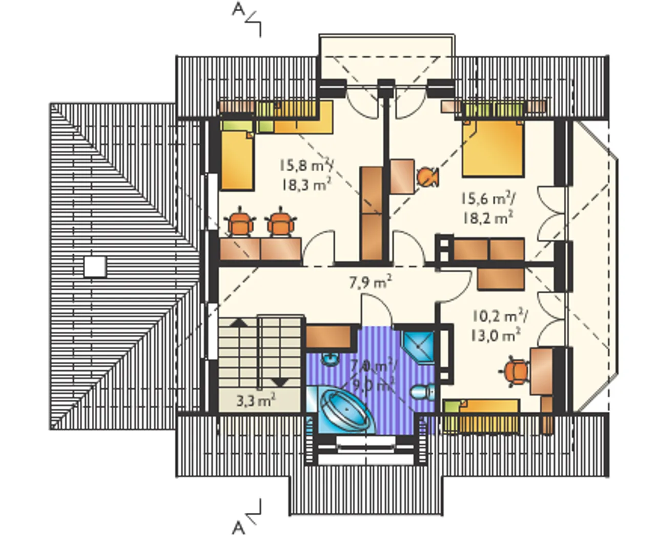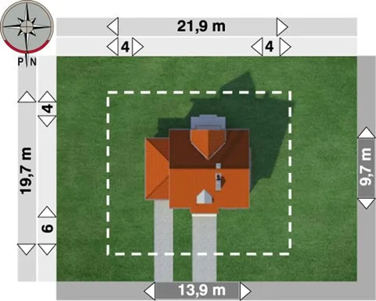 - rzut dachu - ukazuje jego kształt, wymiary, kąt nachylenia połaci, rozmieszczenie okien połaciowych, lukarn, świetlików i rur spustowych, pokazuje rozmieszczenie kominów i informuje o sposobie odwodnienia: rozmieszczeniu i rozmiarach rynien