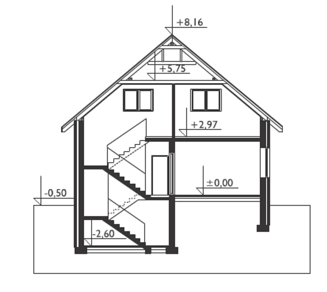 - przekroje - pokazują wszystkie elementy budynku po przecięciu go wzdłuż lub w poprzek od dachu do fundamentów tj. warstwy podłogi, stropów i dachu