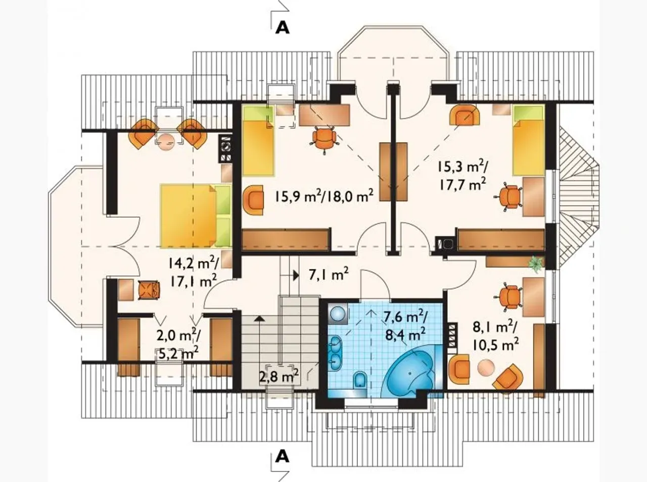 - rzut dachu - ukazuje jego kształt, wymiary, kąt nachylenia połaci, rozmieszczenie okien połaciowych, lukarn, świetlików i rur spustowych, pokazuje rozmieszczenie kominów i informuje o sposobie odwodnienia: rozmieszczeniu i rozmiarach rynien