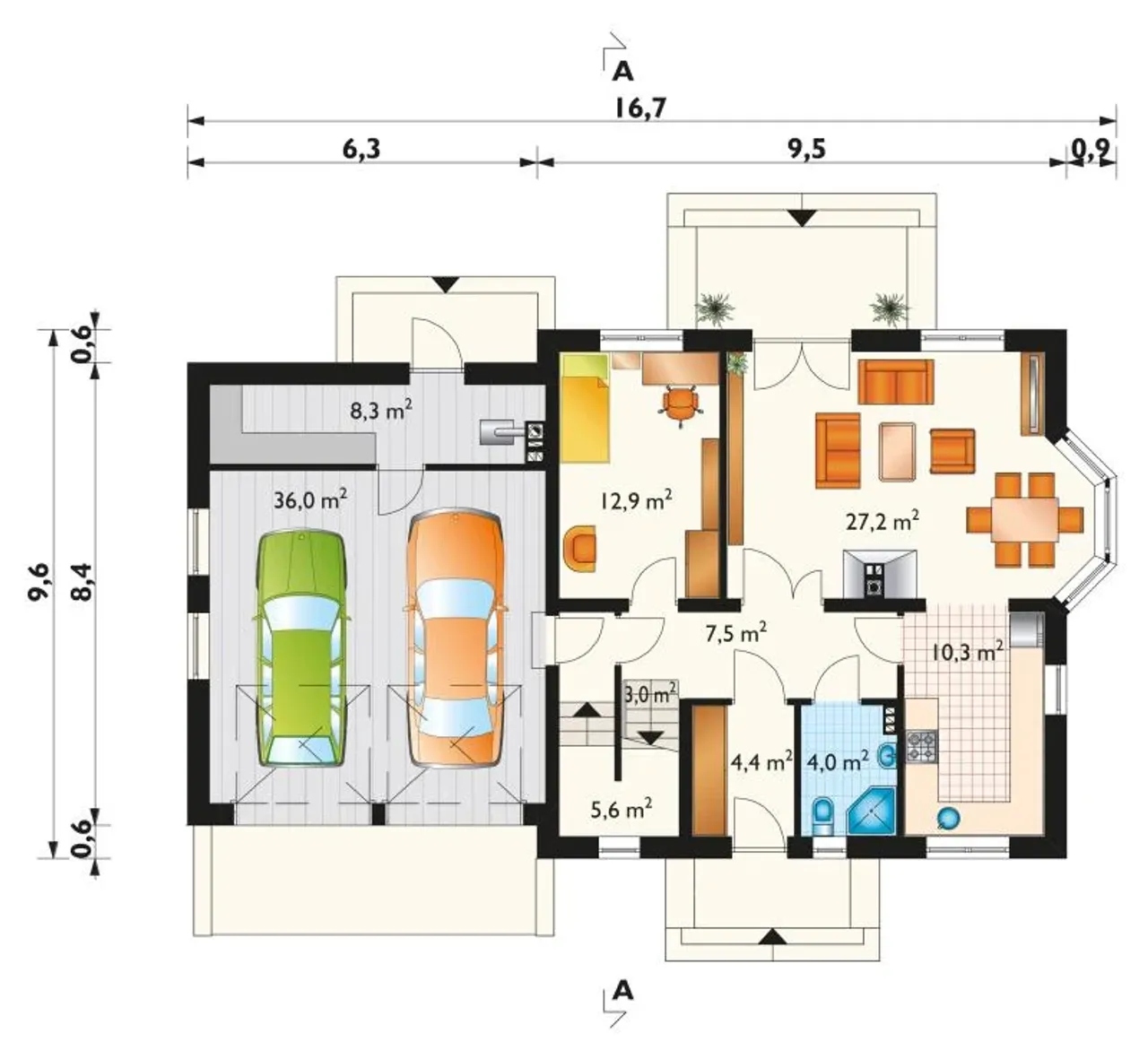 - elewacje - pokazują dokładny wygląd domu od frontu, z tyłu i z boków