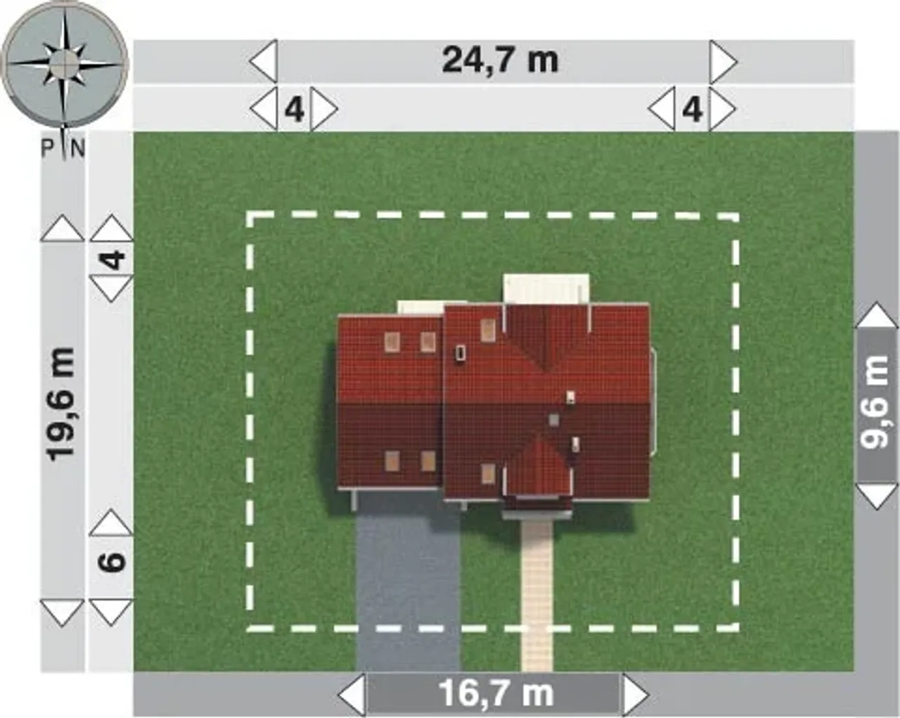 - rzut dachu - ukazuje jego kształt, wymiary, kąt nachylenia połaci, rozmieszczenie okien połaciowych, lukarn, świetlików i rur spustowych, pokazuje rozmieszczenie kominów i informuje o sposobie odwodnienia: rozmieszczeniu i rozmiarach rynien