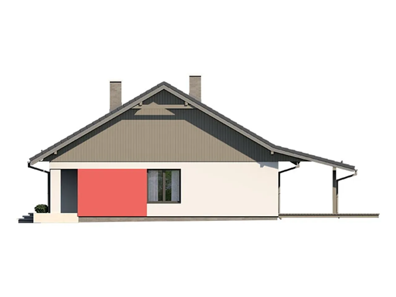 Projektując ten dom, postawiono na wydzielone cztery wygodne pokoje, dając Ci mnóstwo przestrzeni do indywidualnej aranżacji. Praktyczny układ sprzyja łatwej komunikacji, a każda strefa - dzienna i prywatna - zyskuje optymalne doświetlenie dzięki dużym przeszkleniom tarasowym. Dwuspadowy dach, o kącie nachylenia 30°, doskonale wpisuje się w klasyczne oraz nowoczesne realizacje, a zastosowana dachówka lub blachodachówka podkreśli estetykę budynku przez lata.