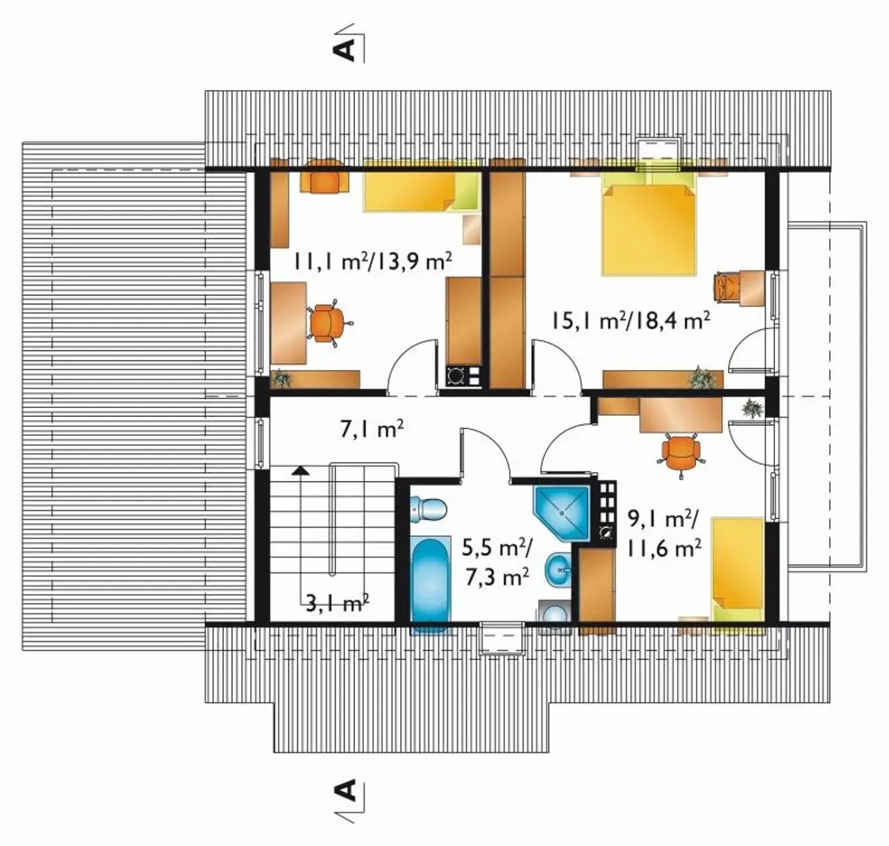 - rzut dachu - ukazuje jego kształt, wymiary, kąt nachylenia połaci, rozmieszczenie okien połaciowych, lukarn, świetlików i rur spustowych, pokazuje rozmieszczenie kominów i informuje o sposobie odwodnienia: rozmieszczeniu i rozmiarach rynien