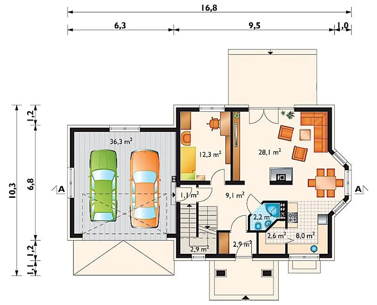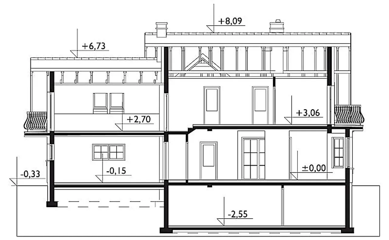 - przekroje - pokazują wszystkie elementy budynku po przecięciu go wzdłuż lub w poprzek od dachu do fundamentów tj. warstwy podłogi, stropów i dachu