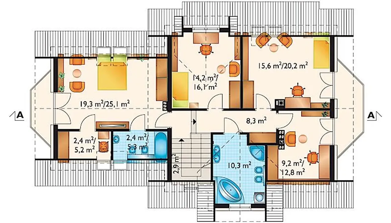 - elewacje - pokazują dokładny wygląd domu od frontu, z tyłu i z boków