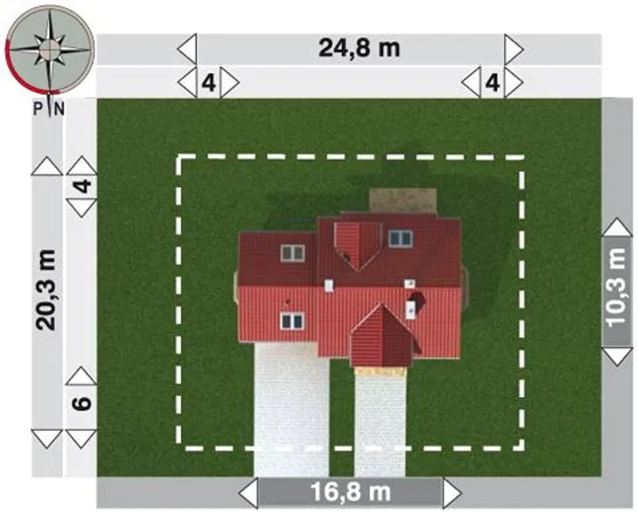 - rzut dachu - ukazuje jego kształt, wymiary, kąt nachylenia połaci, rozmieszczenie okien połaciowych, lukarn, świetlików i rur spustowych, pokazuje rozmieszczenie kominów i informuje o sposobie odwodnienia: rozmieszczeniu i rozmiarach rynien