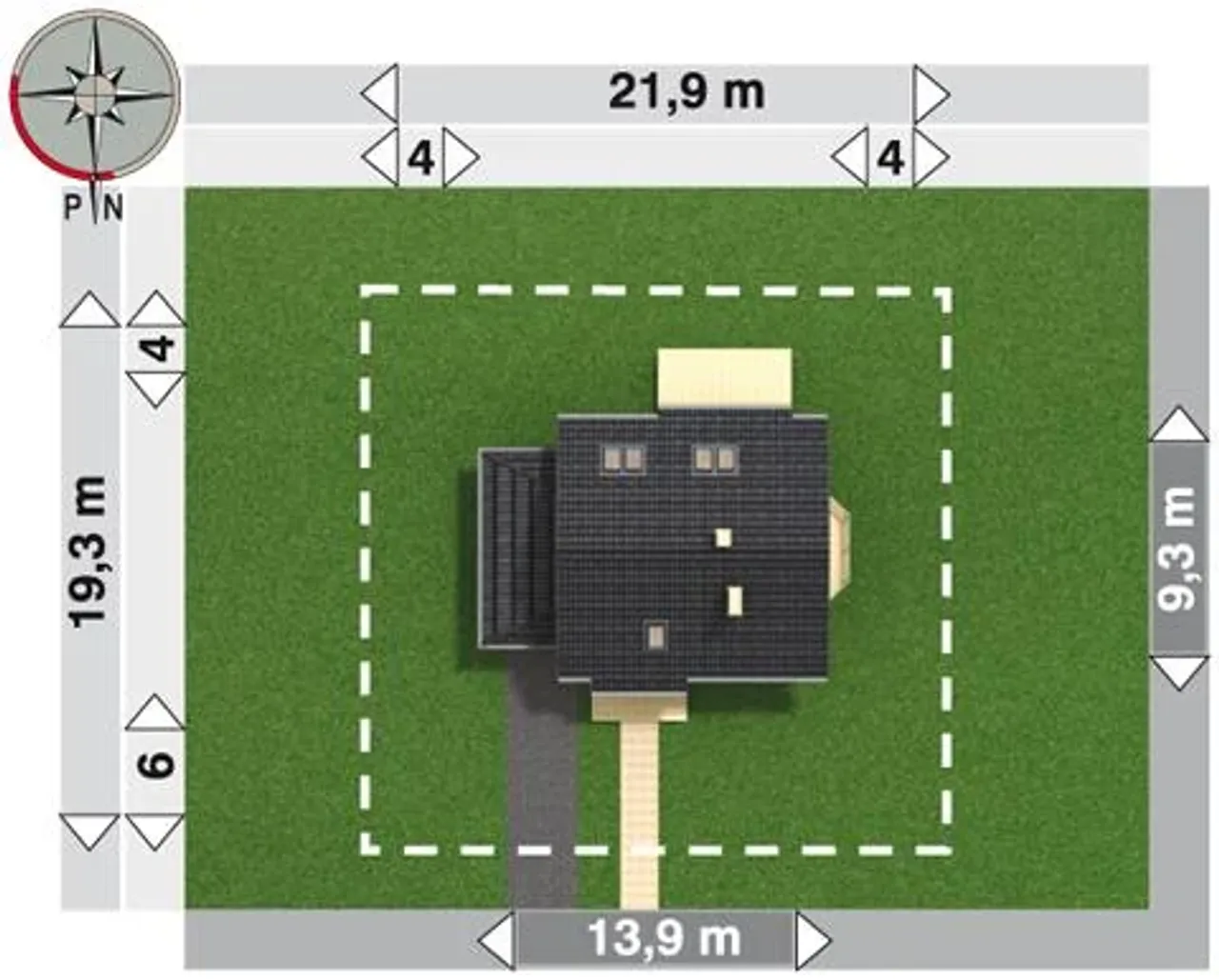 - rzut dachu - ukazuje jego kształt, wymiary, kąt nachylenia połaci, rozmieszczenie okien połaciowych, lukarn, świetlików i rur spustowych, pokazuje rozmieszczenie kominów i informuje o sposobie odwodnienia: rozmieszczeniu i rozmiarach rynien