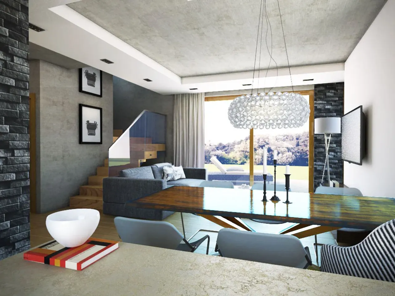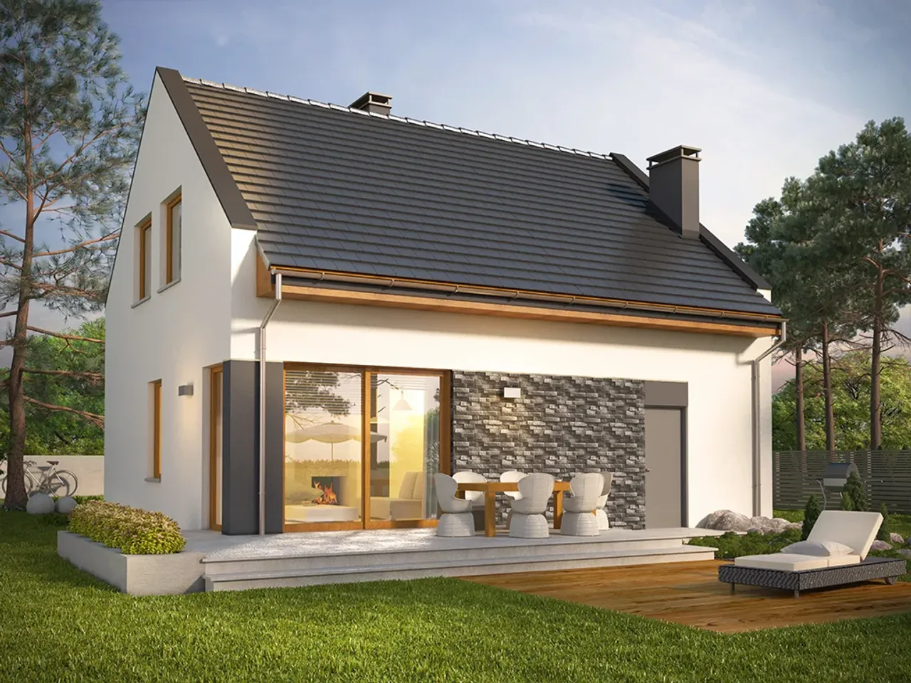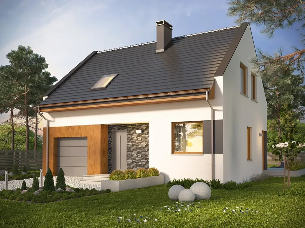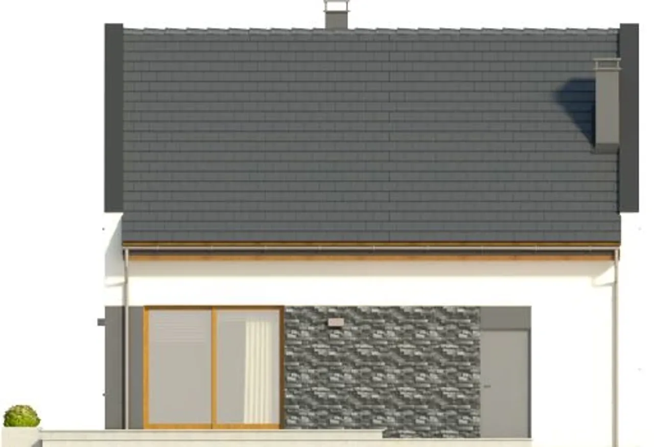 W strefie wejściowej zastosowano płytki kamienne, a w garażu wykończono go płytami drewnianymi. Te elementy wprowadzają trójwymiarowość i zróżnicowanie do prostego designu budynku. Duże okno narożne z wyjściem na taras umiejscowione z tyłu dodaje lekkości i estetyki.