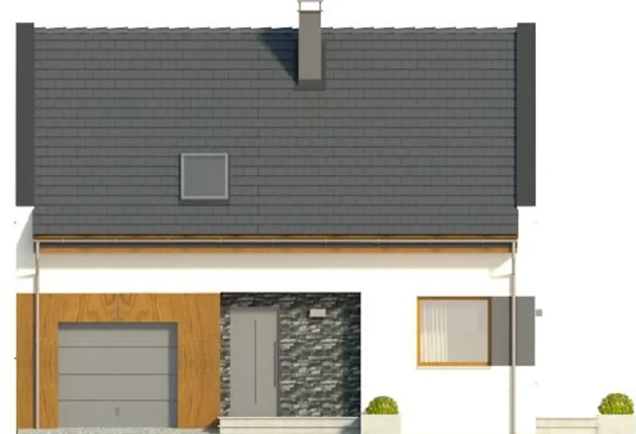 Projekt Como to mały, nowoczesny dom z poddaszem i garażem jednostanowiskowym, którego powierzchnia nie przekracza 100 m2. Dom charakteryzuje się dachem dwuspadowym z podwyższonymi ścianami szczytowymi, co nadaje mu elegancki wygląd i nowoczesny styl.