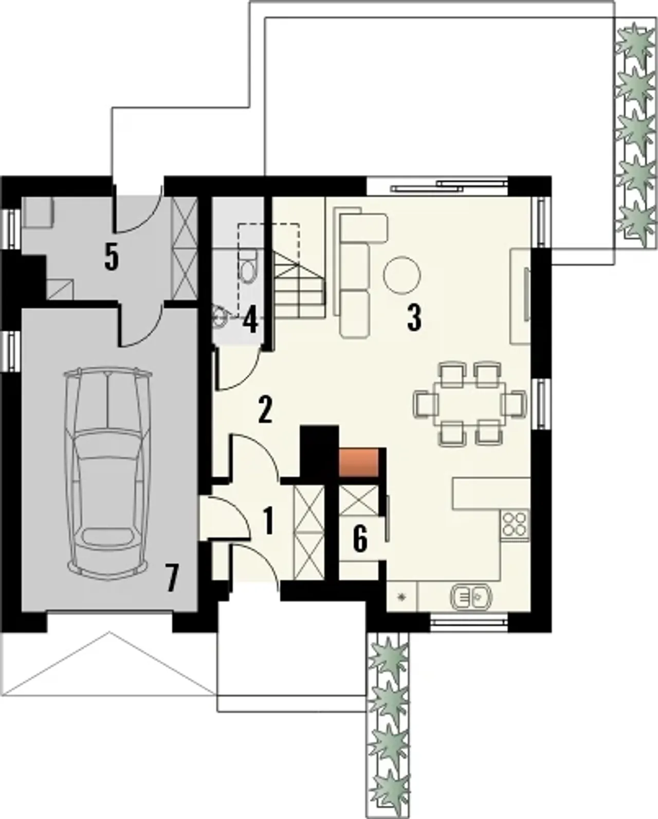 Parter jest podzielony na dwie główne strefy. Znajduje się tu część dzienna z salonem, jadalnią oraz otwartą kuchnią. Część techniczna obejmuje garaż oraz pomieszczenie gospodarcze z dostępem z zewnątrz. W część dziennej zaplanowano także WC pod biegiem schodów oraz niewielką spiżarnię obok kuchni.