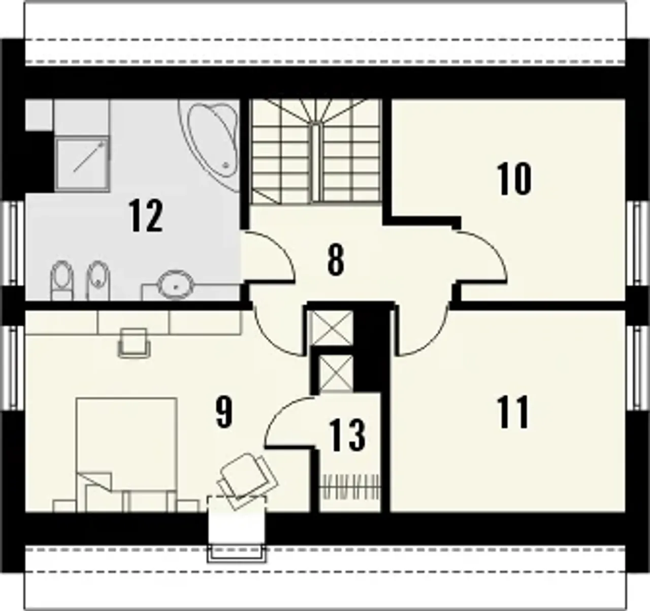 Piętro mieści trzy sypialnie, z których jedna jest wyposażona w osobną garderobę. Na piętrze znajduje się również łazienka. Dokumentacja projektu Como dostępna jest w wersji lustrzanego odbicia.