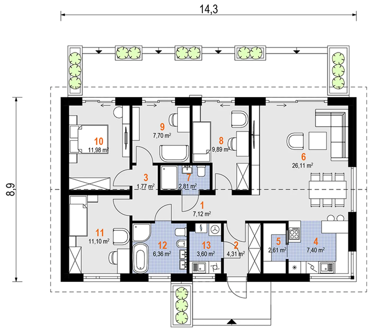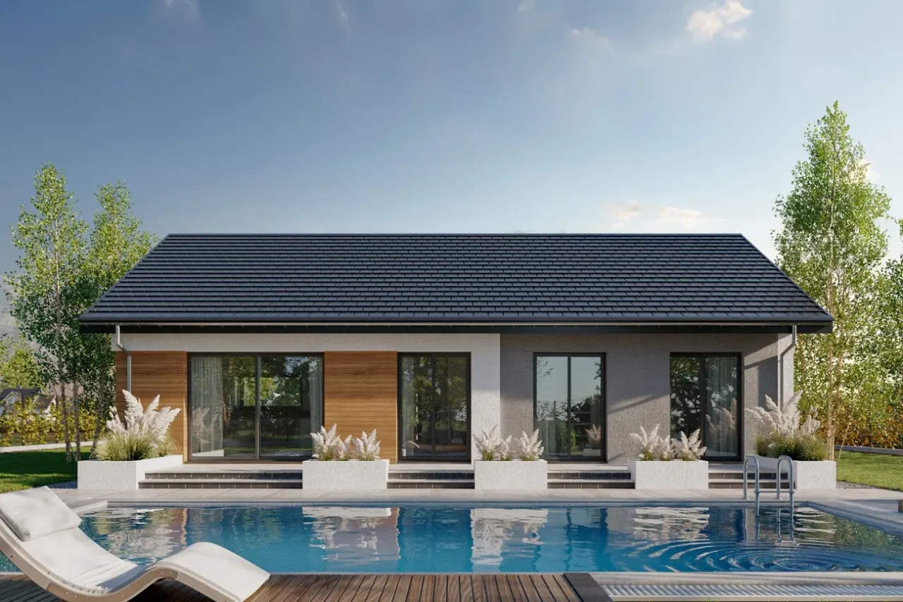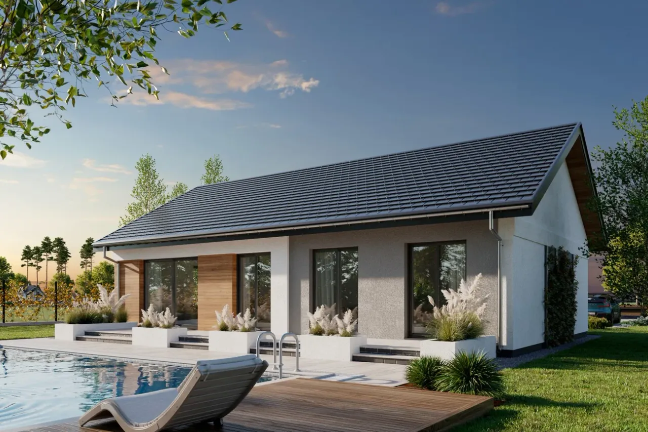 Projekt Cyklamen Beta to idealne połączenie nowoczesności i elegancji, które przyciąga wzrok od pierwszego spojrzenia. Szuka się właśnie takich propozycji, które potrafią zaskoczyć swoim unikalnym charakterem i funkcjonalnością. Wnętrza wydają się być zaprojektowane z myślą o każdym detalu, co sprawia, że każdy pokój ma swój wyjątkowy klimat. Podwójne drzwi tarasowe to idealne rozwiązanie dla osób, które kochają naturalne światło i pragną mieć naturę na wyciągnięcie ręki. Ciekawie ułożona bryła domu Cyklamen Beta zdecydowanie wyróżnia się spośród innych projektów, nadając mu nietuzinkowy wygląd i ducha nowoczesności.