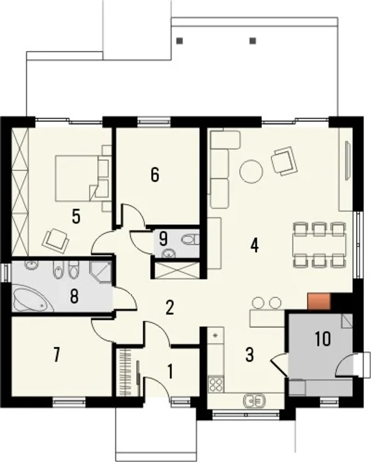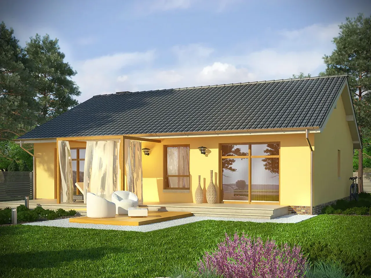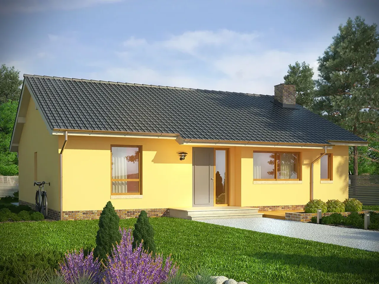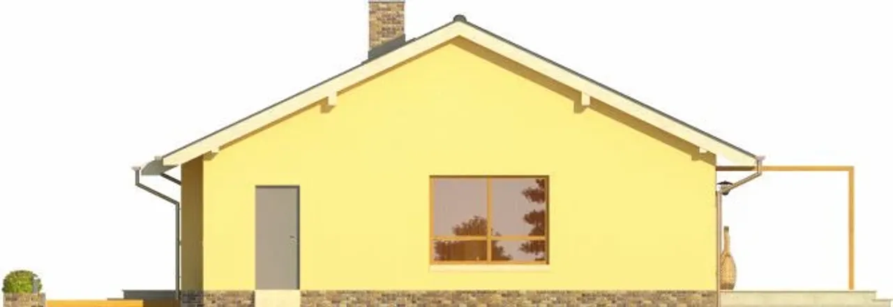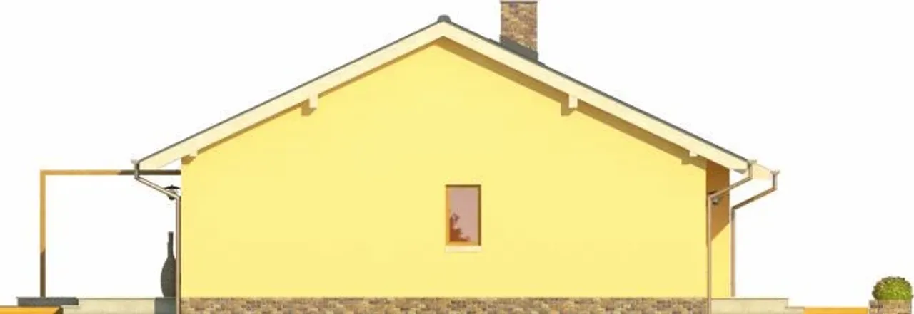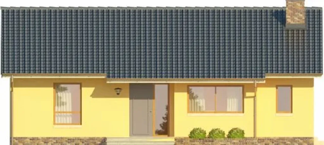 Gotowy projekt CYPR to budynek parterowy o prostej bryle w technologii murowanej. Budynek zaprojektowany został w stylu tradycyjnym z dachem dwuspadowym. W projekcie nie przewidziano podpiwniczenia. Do budynku przynależy garaż . W projekcie nie przewidziano pomieszczenia na garderobę. Projekt nie przewiduje spiżarni. W przestronnym salonie znajduje się kominek.