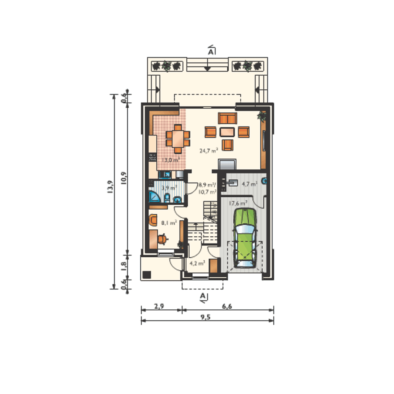 - rzuty wszystkich kondygnacji- pokazuje rozmieszczenie poszczególnych pomieszczeń i ich wymiary, powierzchnie, rozmieszczenie ścian, rozmieszczenie otworów drzwiowych, okiennych, urządzeń kuchennych i sanitarnych