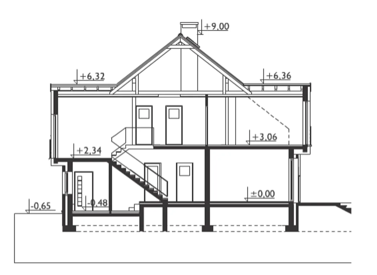 - przekroje - pokazują wszystkie elementy budynku po przecięciu go wzdłuż lub w poprzek od dachu do fundamentów tj. warstwy podłogi, stropów i dachu
