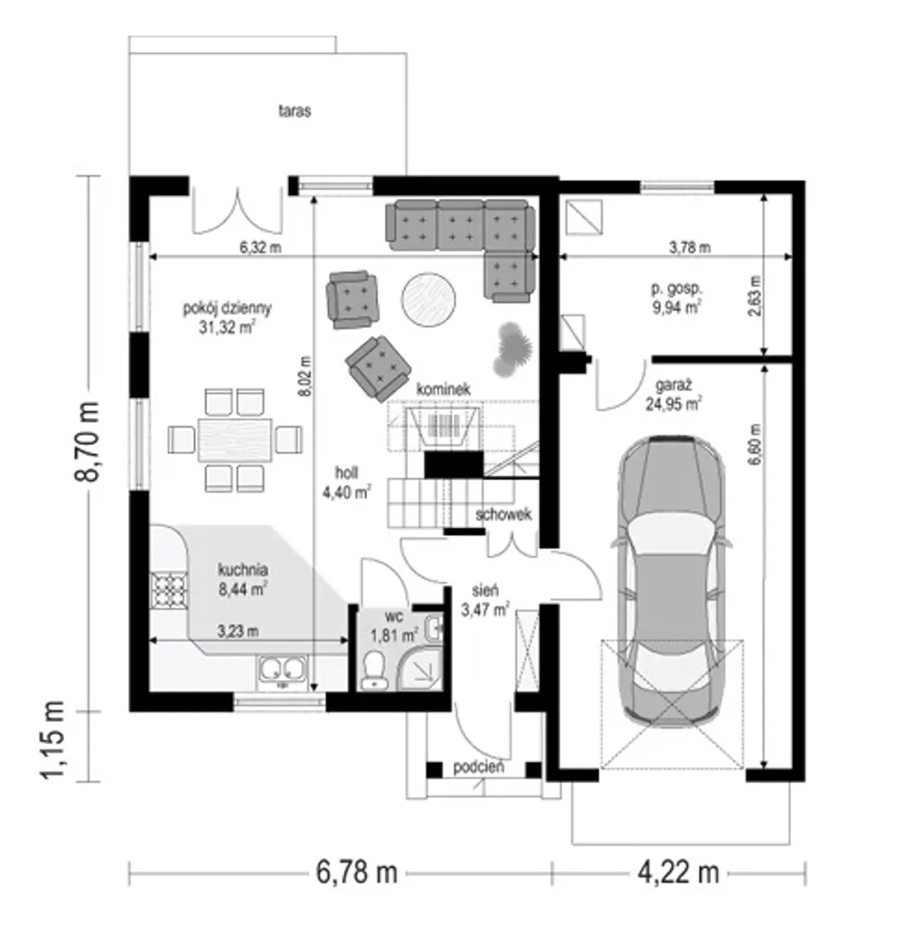 Wypełnij formularz i otrzymaj rysunki w pdf z dokładnymi wymiarami budynku i pomieszczeń (długość, szerokość, wysokość) dla projektu D03 z garażem