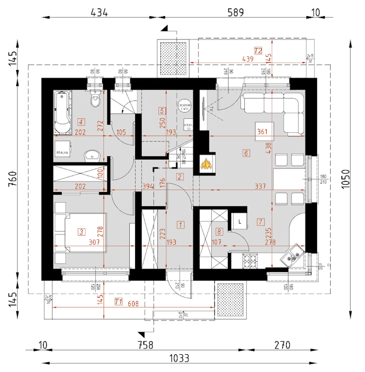 Wypełnij formularz i otrzymaj rysunki w pdf z dokładnymi wymiarami budynku i pomieszczeń (długość, szerokość, wysokość) dla projektu D170D - WT2021 wersja drewniana