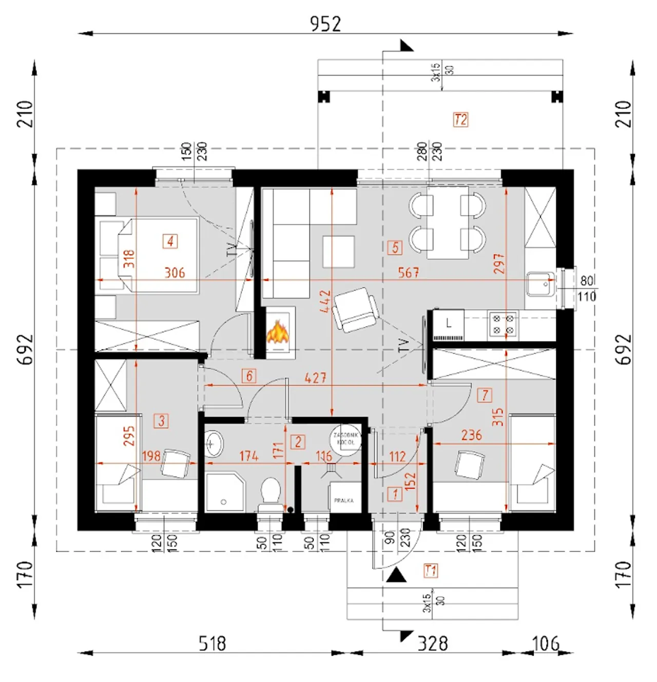 Wypełnij formularz i otrzymaj rysunki w pdf z dokładnymi wymiarami budynku i pomieszczeń (długość, szerokość, wysokość) dla projektu D326 - WT2021 wersja murowana