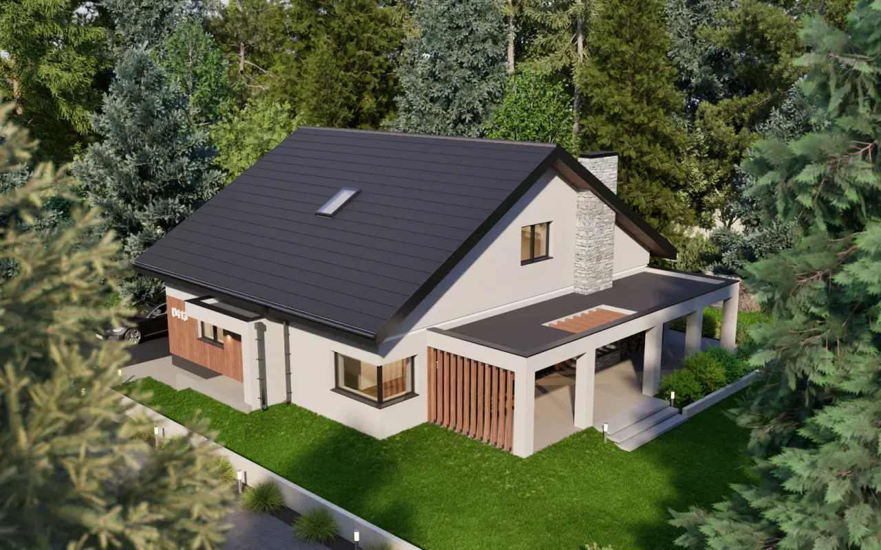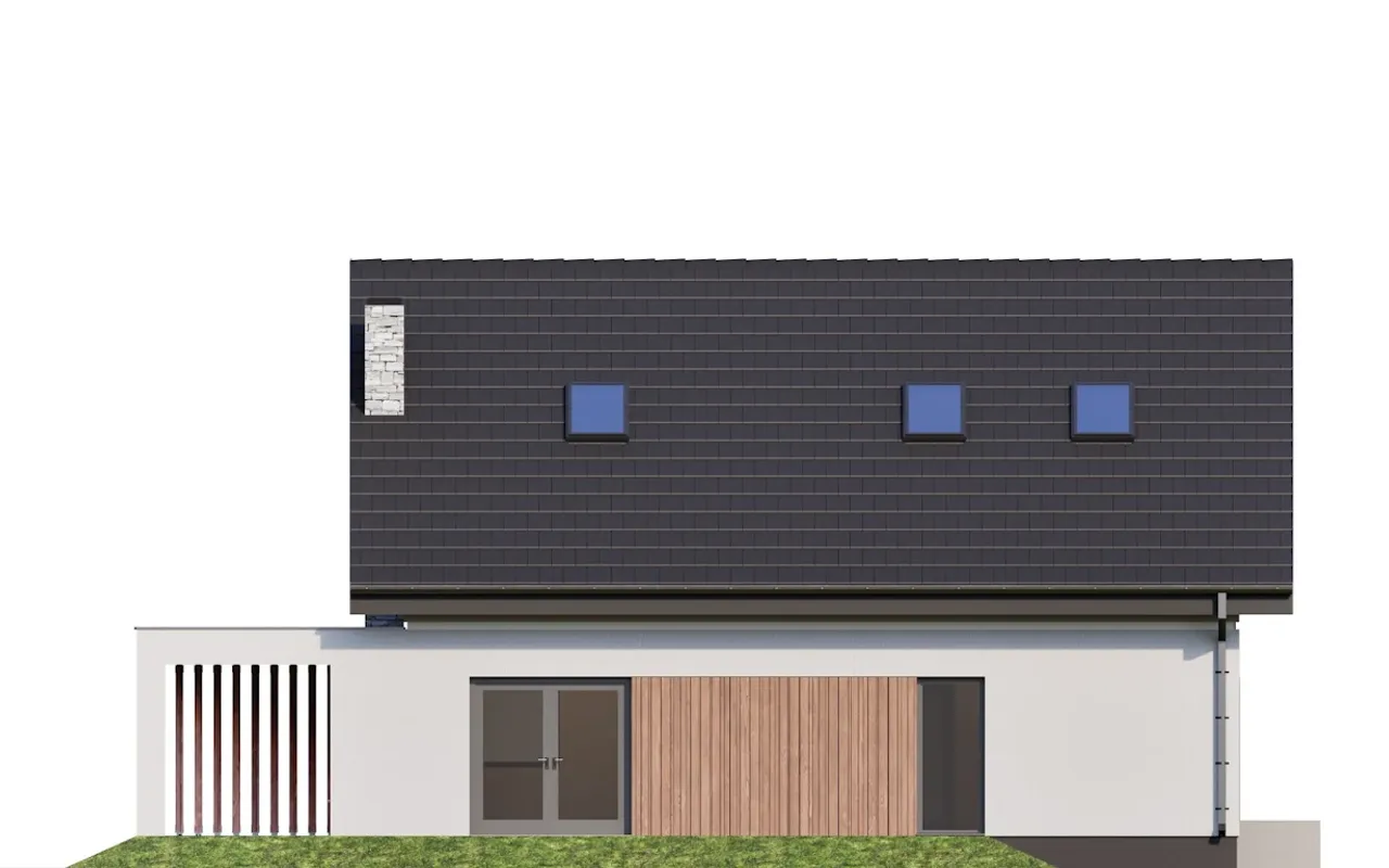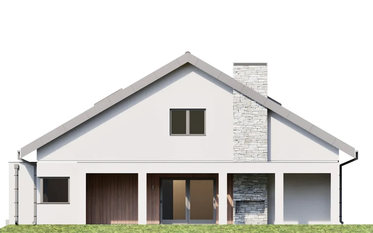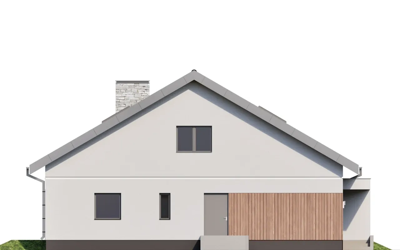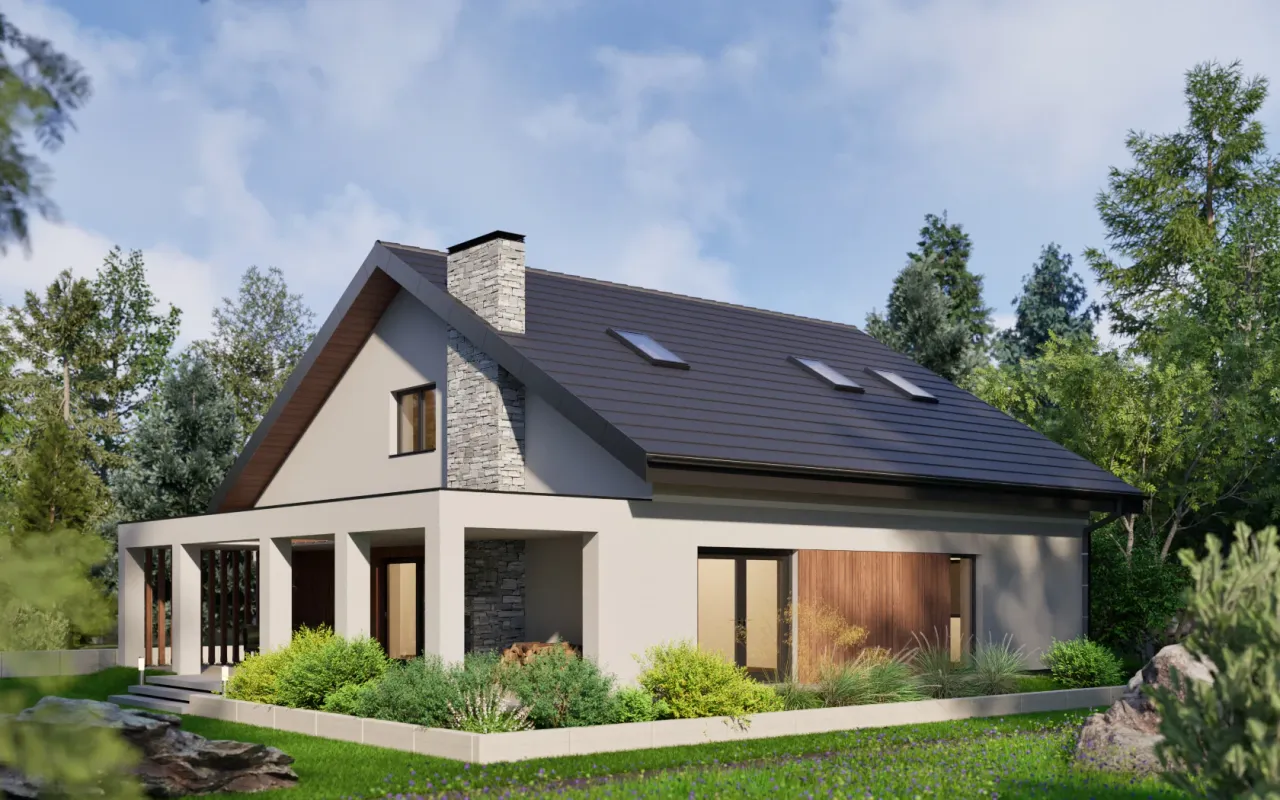 - Elewacja: tynk cienkowarstwowy, okładzina imitująca drewno, płytki elewacyjne.
