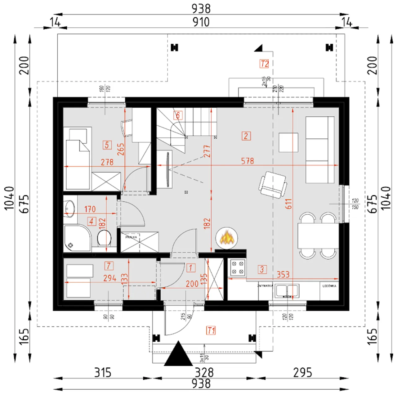 Wypełnij formularz i otrzymaj rysunki w pdf z dokładnymi wymiarami budynku i pomieszczeń (długość, szerokość, wysokość) dla projektu D417 - WT2021 Paulinka z ogrzewaniem na pellet wersja drewniana