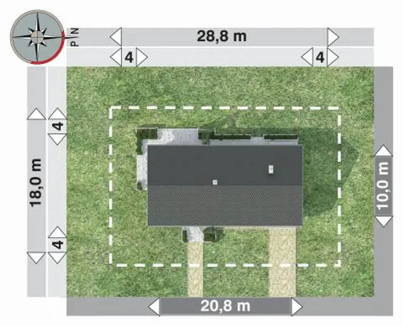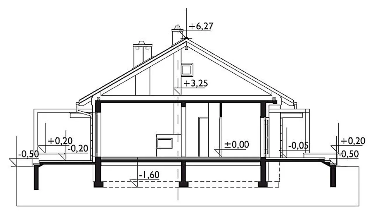 - rzut dachu - ukazuje jego kształt, wymiary, kąt nachylenia połaci, rozmieszczenie okien połaciowych, lukarn, świetlików i rur spustowych, pokazuje rozmieszczenie kominów i informuje o sposobie odwodnienia: rozmieszczeniu i rozmiarach rynien