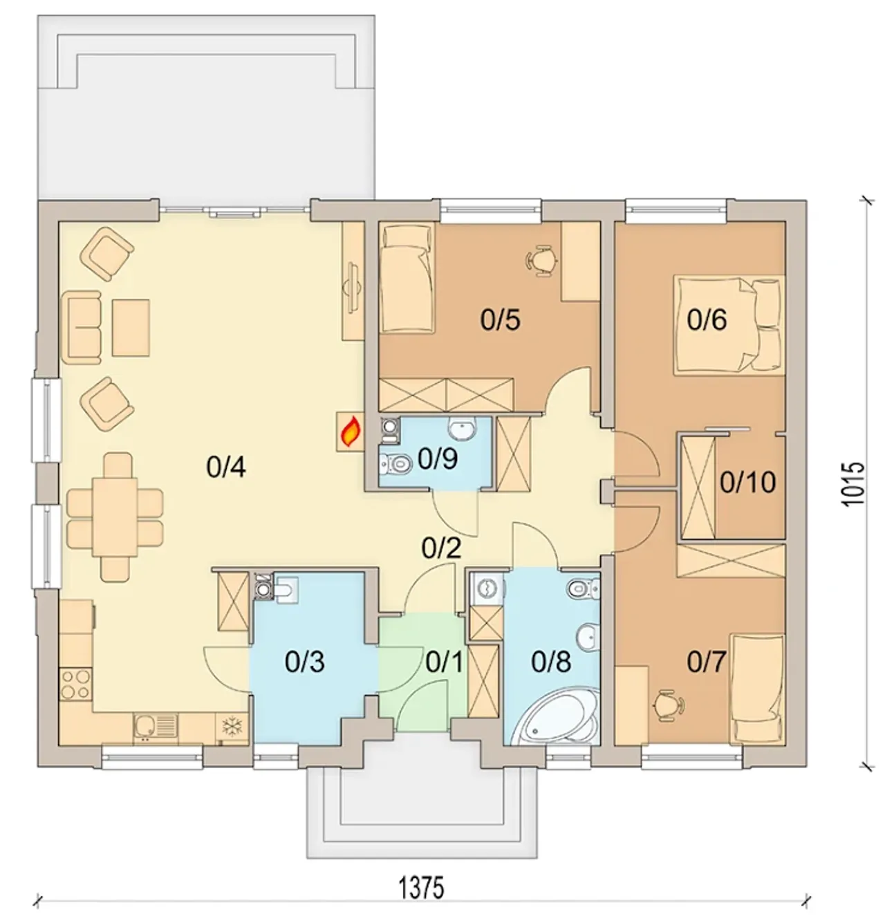 Projekt daje możliwość wyboru energooszczędnego ogrzewania: zarówno gazowego, jak i na paliwo stałe. Parterowy dom z kominkiem zachwyca prostotą rozwiązań oraz funkcjonalnością na co dzień. Brak podpiwniczenia przekłada się na niższe koszty budowy i łatwiejszy dostęp do wszystkich pomieszczeń. Kalenica równoległa do drogi ułatwia lokalizację budynku na większości działek. Dzięki temu dom Daktyl 4 staje się uniwersalną propozycją dla wielu nowych inwestorów.