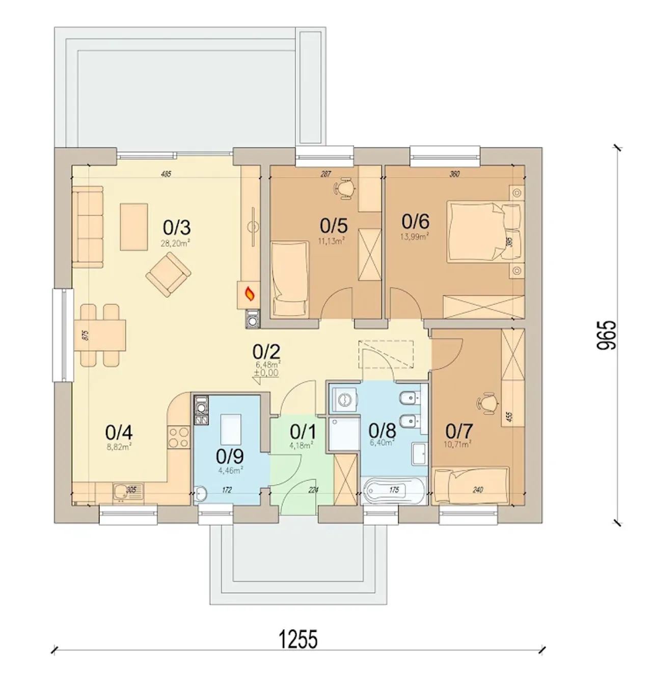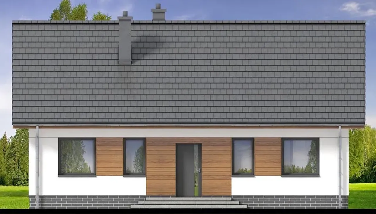Dom jednorodzinny Daktyl 5 mini archand to rozwiązanie dla miłośników nowoczesnych brył i praktycznych przestrzeni. Parterowy rozkład z czterema pokojami umożliwia swobodną aranżację pokoi dziecięcych, gabinetu czy sypialni. Kominek, przewidziany w projekcie, tworzy przytulną atmosferę i staje się sercem domowego życia.