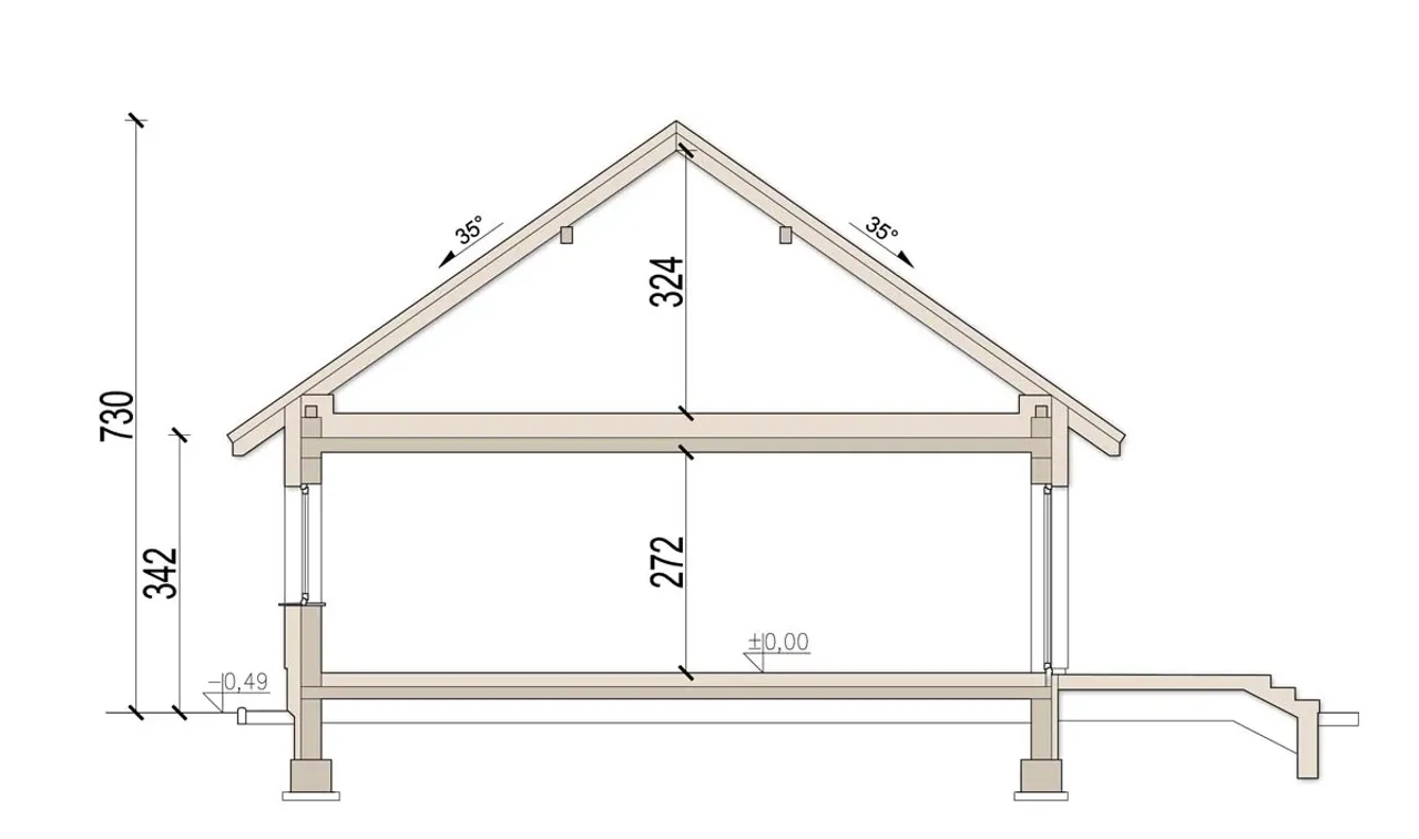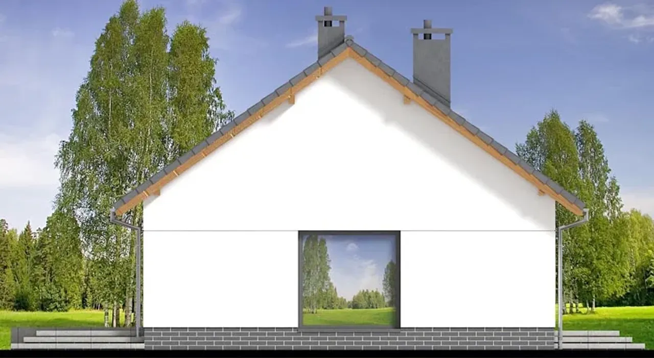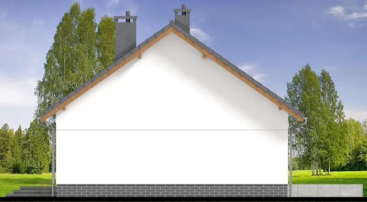 Budynek wybudowany na bazie tego projektu korzysta z żelbetowych fundamentów oraz mocnej monolitycznej płyty stropowej, które wpływają na stabilność i wieloletnie bezpieczeństwo eksploatacji. Dwuspadowy, drewniany dach z wykończeniem dachówką ceramiczną lub betonową nadaje budynkowi świeżości, współczesnego wyglądu i doskonałej trwałości przez dekady. Kalenica ułożona równolegle do drogi łatwo wpisuje się w typowe warunki zabudowy.