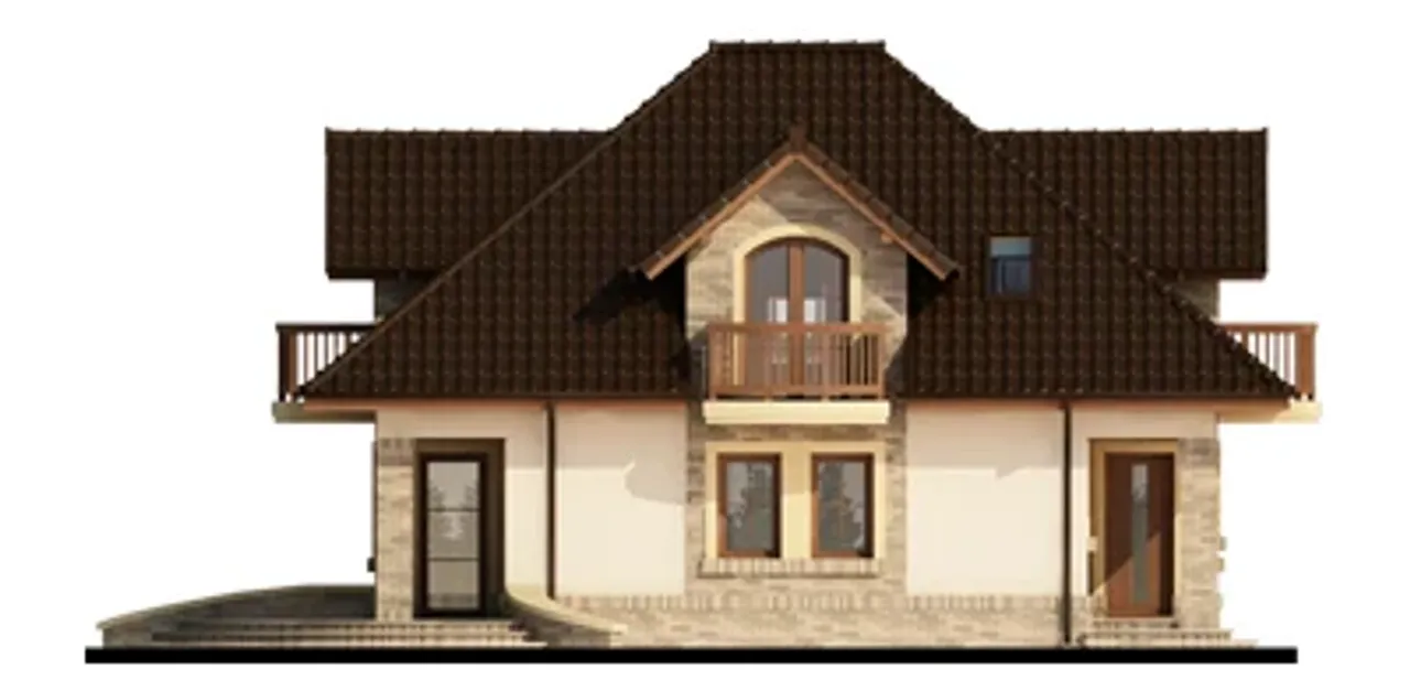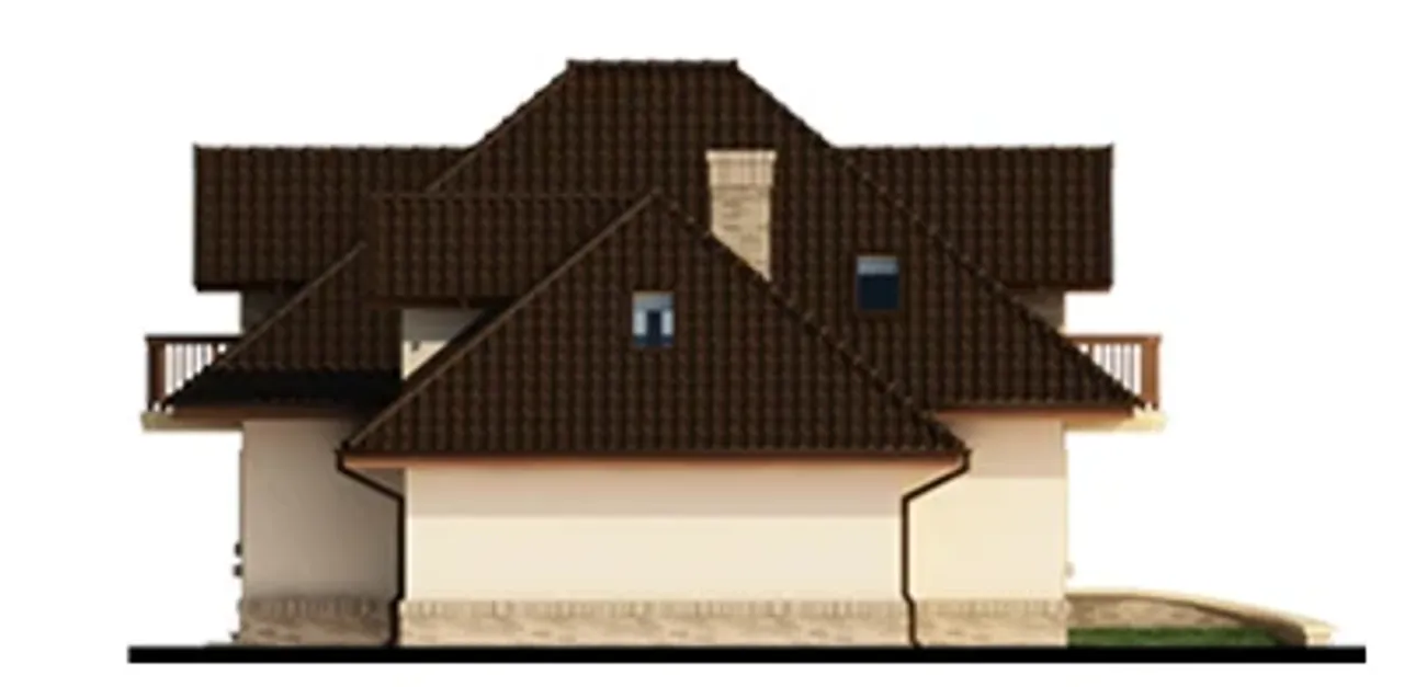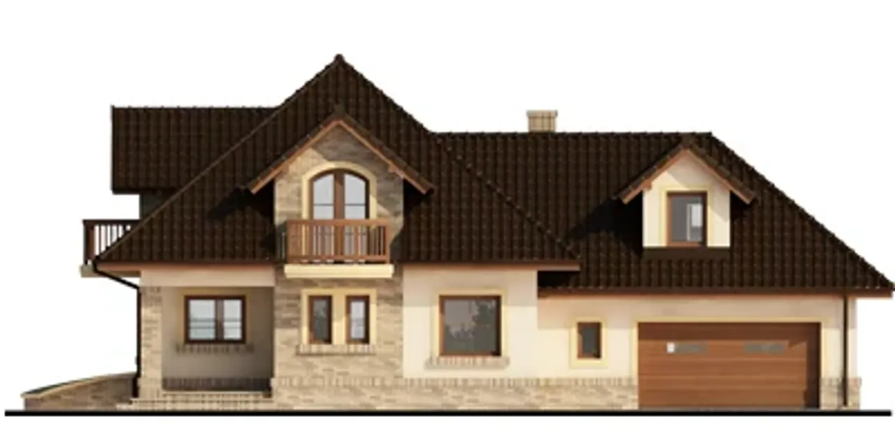 Projekt domu Damokles 2 to parterowy dom z poddaszem pokryty dachem wielospadowym, budynek posiada tradycyjny reprezentacyjny wygląd, drzwi frontowe zostały zadaszone. Dodatkowo do budynku dobudowano garaż dwustanowiskowy z którego możemy dostać się bezpośrednio do pomieszczenia gospodarczego. W projekcie domu Damokles 2 od strony ogrodu umieszczono częściowo zadaszony taras ozdobiony niewielkim murkiem oraz balkon na poddaszu.