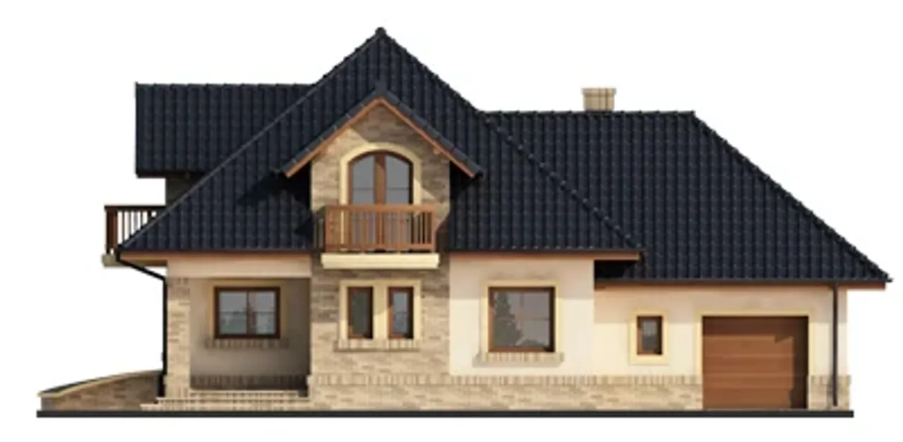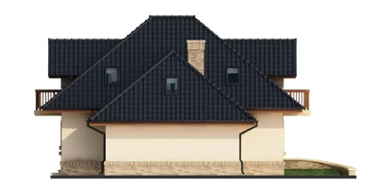 Projekt domu Damokles to parterowy dom z poddaszem pokryty dachem wielospadowym, budynek posiada tradycyjny reprezentacyjny wygląd, drzwi frontowe zostały zadaszone. Dodatkowo do budynku dobudowano garaż jednostanowiskowy z którego możemy dostać się bezpośrednio do pomieszczenia gospodarczego. W projekcie domu Damokles od strony ogrodu umieszczono częściowo zadaszony taras ozdobiony niewielkim murkiem oraz balkon na poddaszu.