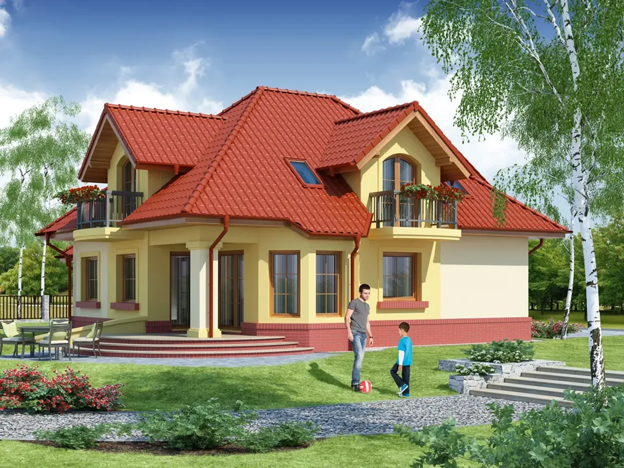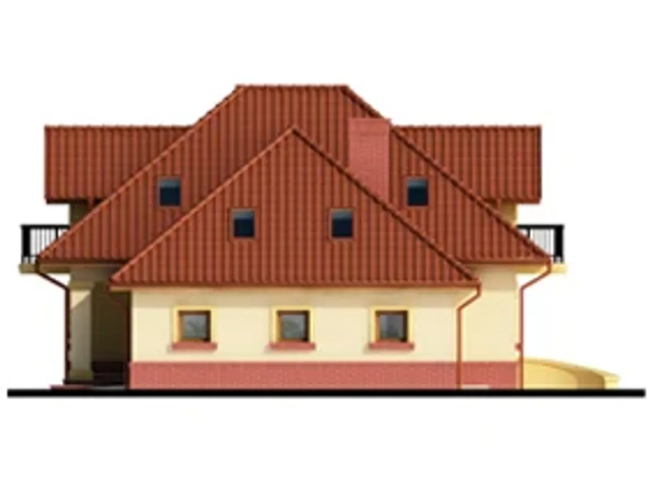 Projekt domu Dandys 1 to parterowy dom z poddaszem pokryty dachem wielospadowym, budynek posiada tradycyjny wygląd, drzwi frontowe zostały zadaszone. Dodatkowo do budynku dobudowano garaż jednostanowiskowy, w którym wydzielono miejsce na pomieszczenie gospodarcze z oddzielnym wyjściem na zewnątrz. W projekcie domu Dandys od strony ogrodu umieszczono częściowo zadaszony taras ozdobiony niewielkim murkiem.