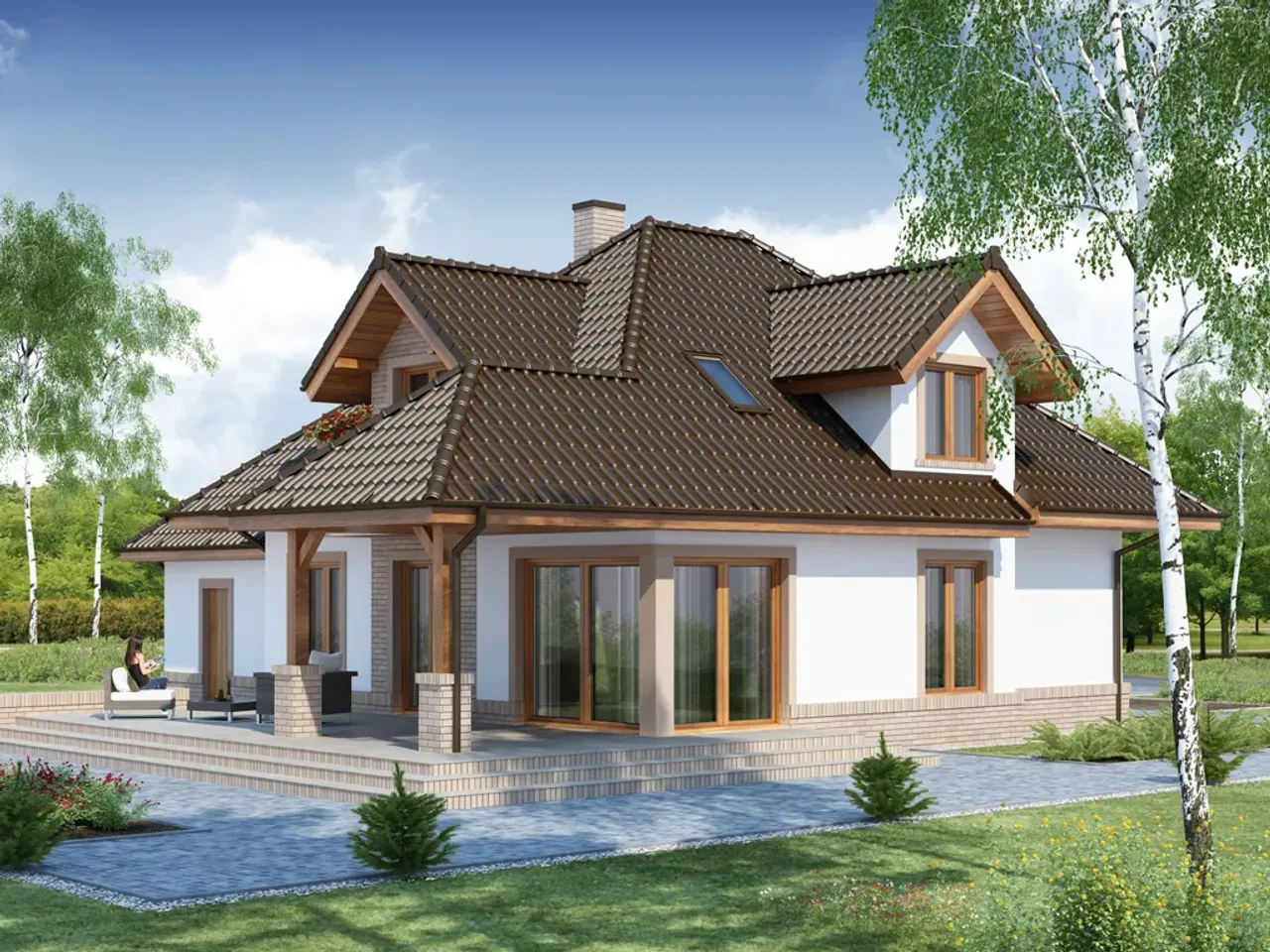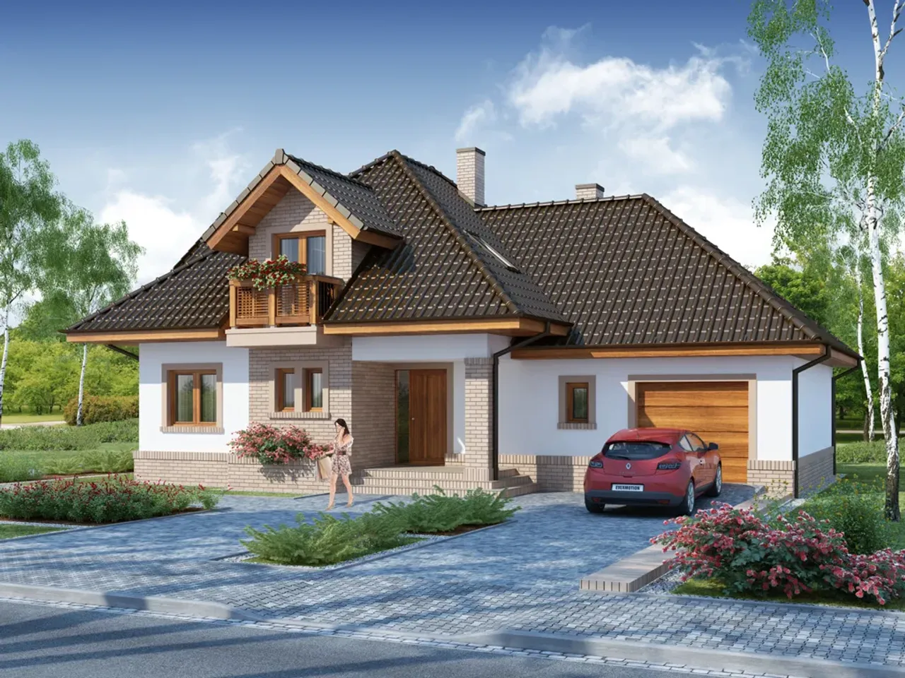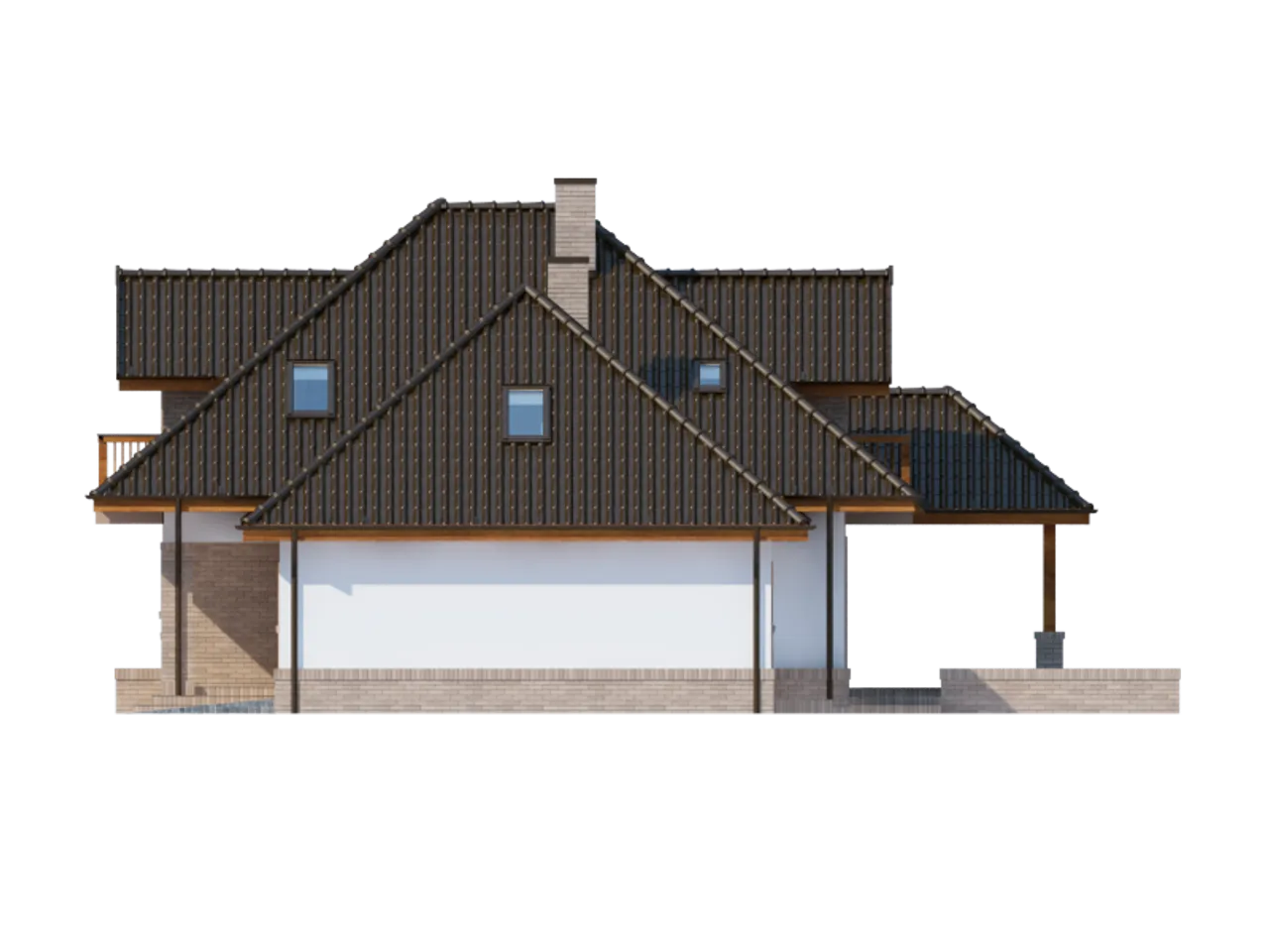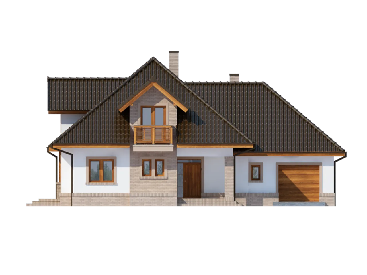 Projekt domu Delos to parterowy dom z poddaszem pokryty dachem wielospadowym, budynek posiada tradycyjny wygląd, drzwi frontowe zostały zadaszone. Dodatkowo do budynku dobudowano garaż jednostanowiskowy, z którego możemy dostać się do pomieszczenia gospodarczego. W projekcie domu Delos salon wraz z jadalnią został dobrze doświetlony światłem dziennym poprzez zastosowanie dużych przeszkleń, dodatkowo z salonu poprzez drzwi tarasowe możemy dostać się na częściowo zadaszony taras.