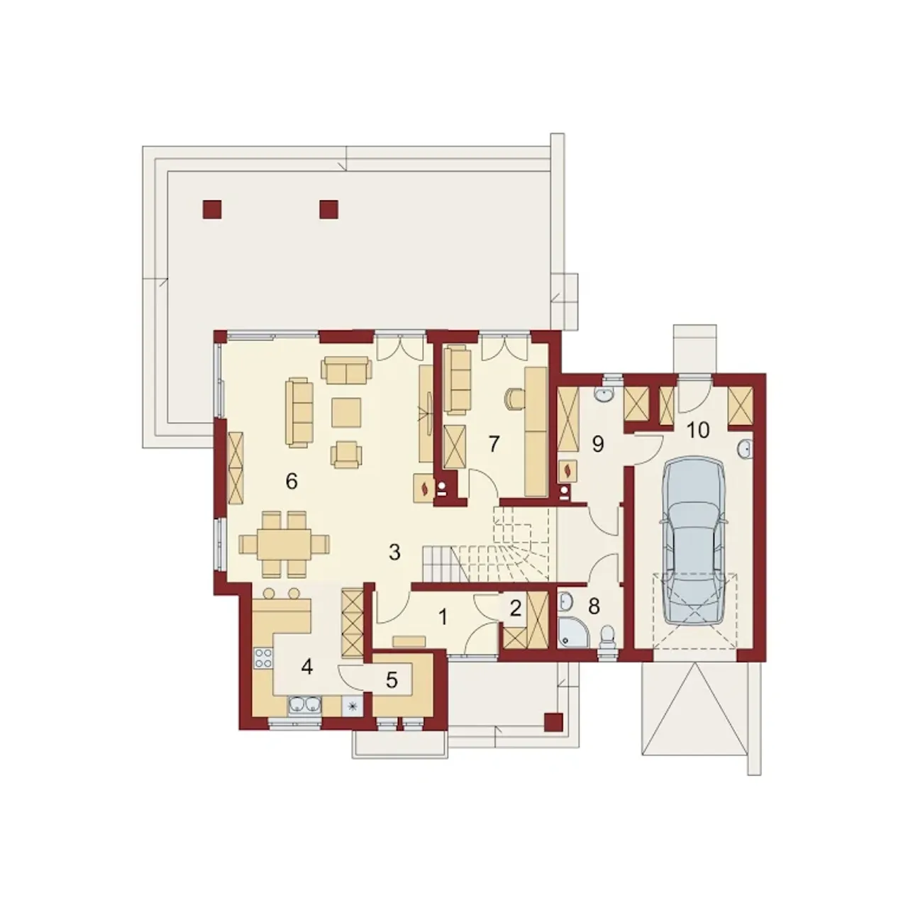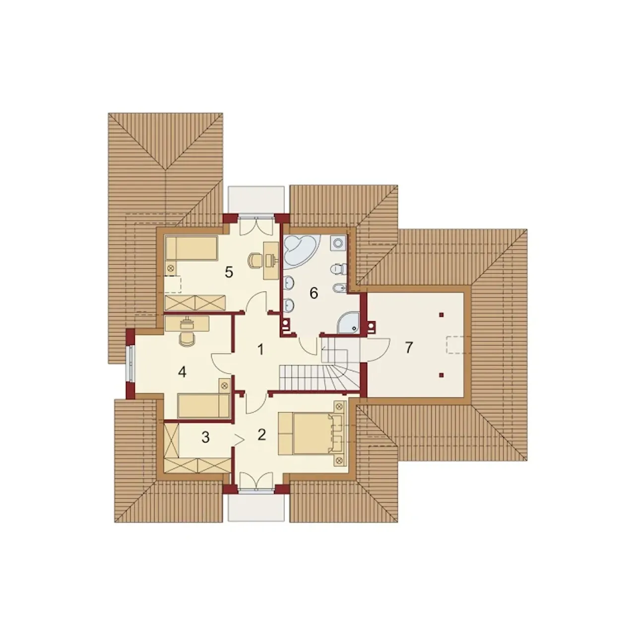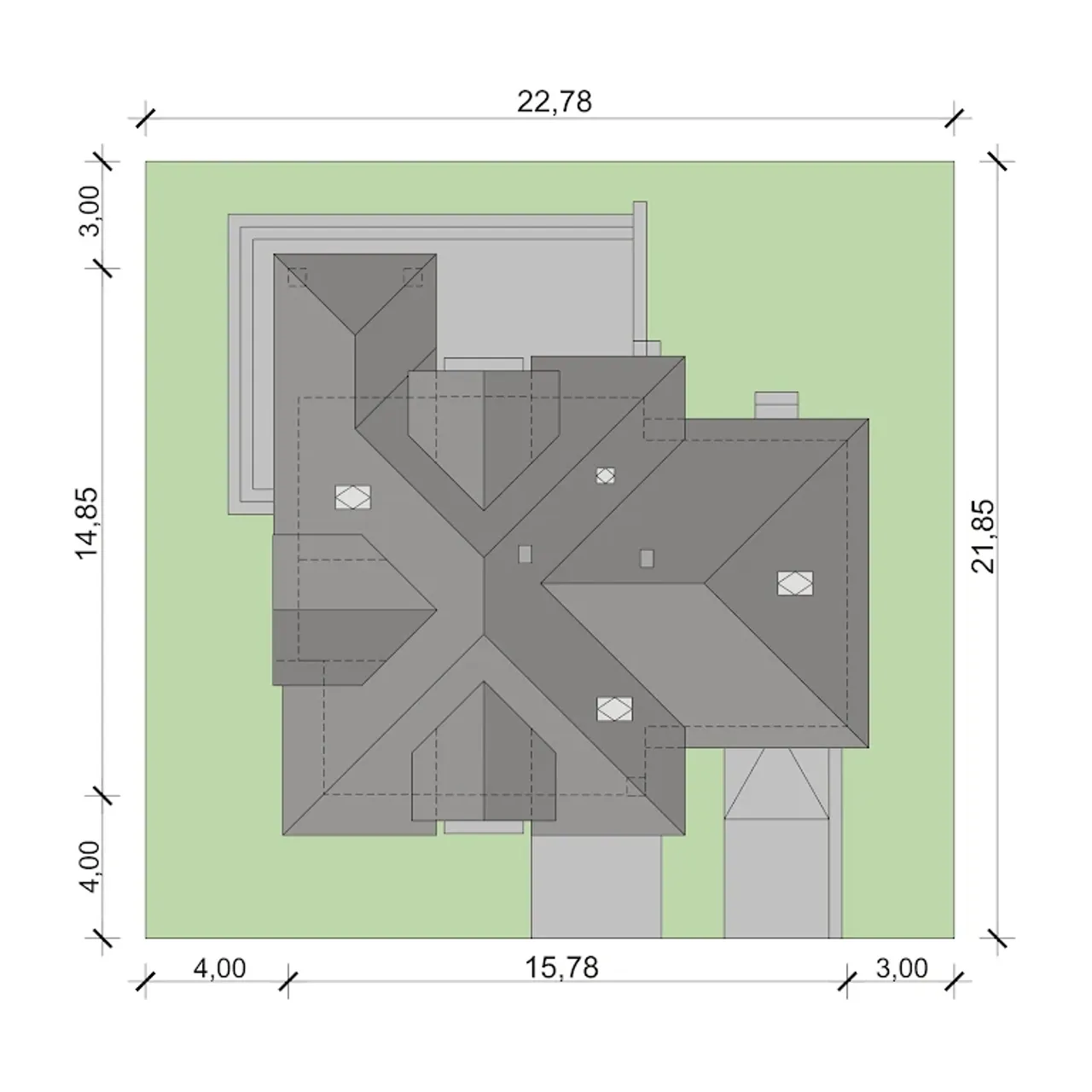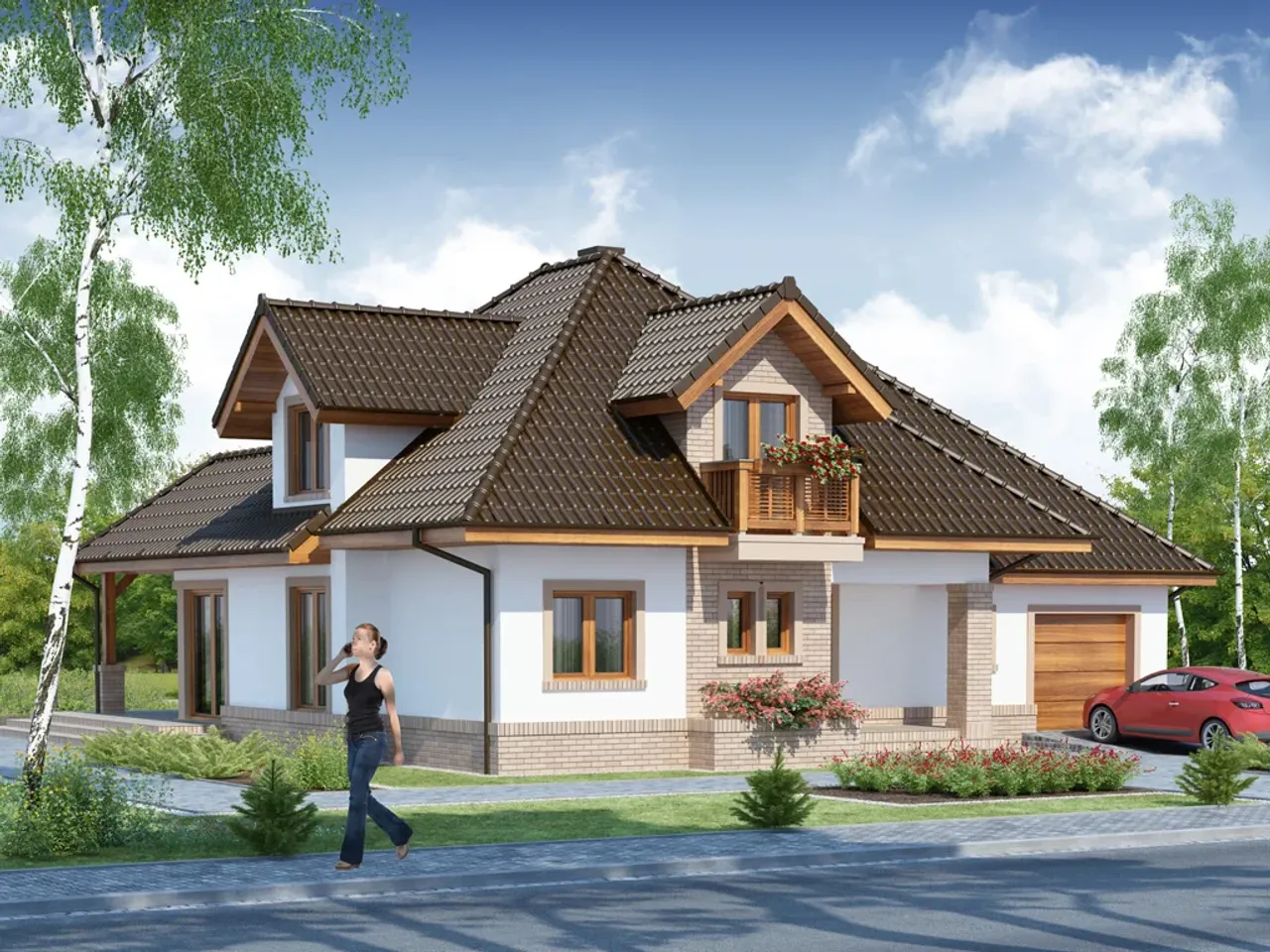 Projekt domu Delos to parterowy dom z poddaszem pokryty dachem wielospadowym, budynek posiada tradycyjny wygląd, drzwi frontowe zostały zadaszone. Dodatkowo do budynku dobudowano garaż jednostanowiskowy, z którego możemy dostać się do pomieszczenia gospodarczego. W projekcie domu Delos salon wraz z jadalnią został dobrze doświetlony światłem dziennym poprzez zastosowanie dużych przeszkleń, dodatkowo z salonu poprzez drzwi tarasowe możemy dostać się na częściowo zadaszony taras.