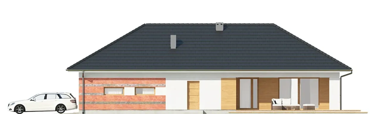 Projekt oferuje cztery wygodne pokoje rozmieszczone na przestronnym parterze, co zwiększa funkcjonalność budynku. Pralnia oddzielona od części mieszkalnej to kolejne udogodnienie w codziennym życiu. Pomysłowa spiżarnia przy kuchni umożliwia wygodne przechowywanie zapasów i porządek w kuchni. Nowoczesna technologia murowana oraz żelbetowy strop wpływają na trwałość, a rolety zewnętrzne dodatkowo zwiększają bezpieczeństwo i komfort użytkowania.
