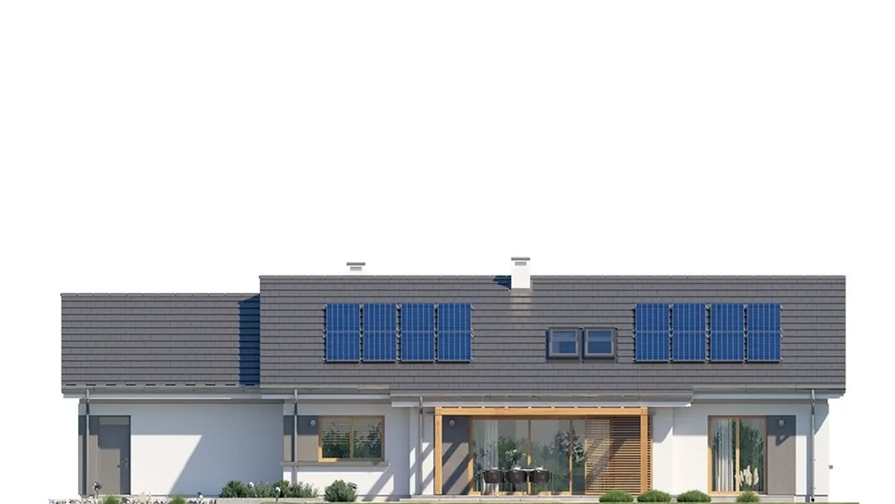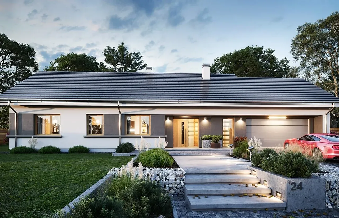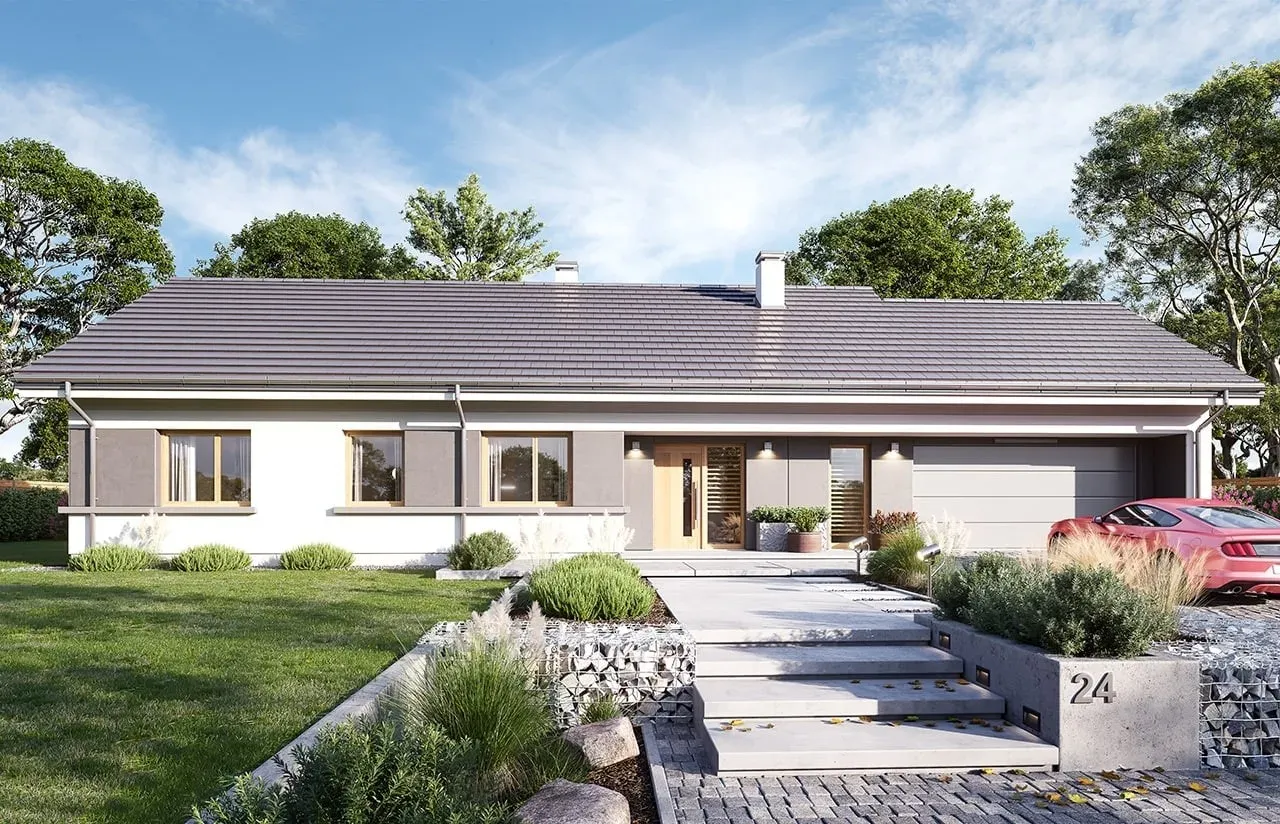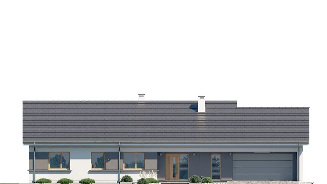 Szukasz praktycznego i efektownego projektu domu, który będzie idealnie wpisywać się w nowoczesne trendy, a przy tym zapewni wygodę całej rodzinie? Ten parterowy dom z dwuspadowym dachem, dwustanowiskowym garażem i przestronnym tarasem został stworzony z myślą o wygodnym, codziennym życiu nawet najbardziej wymagających inwestorów.