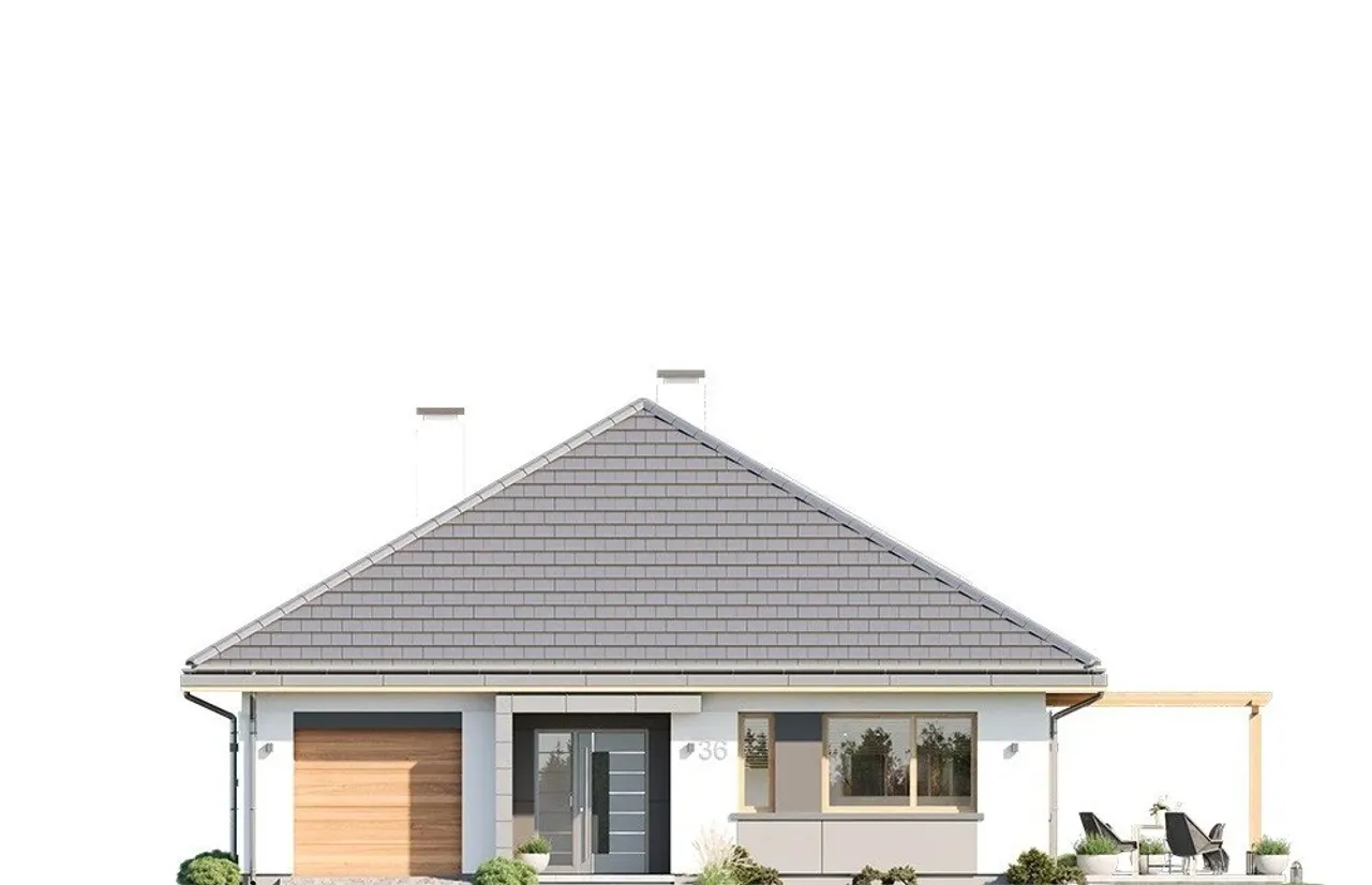 Wybierz projekt domu jednorodzinnego, który łączy funkcjonalność, nowoczesny układ pomieszczeń i trwałe materiały budowlane. Ten dom z prostą bryłą, garażem w bryle i przestronnym tarasem, to rozwiązanie dla osób szukających przemyślanych rozwiązań do codziennego życia. Stwórz miejsce, które odpowiada na realne potrzeby całej rodziny.