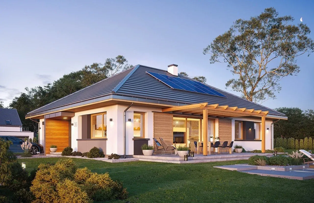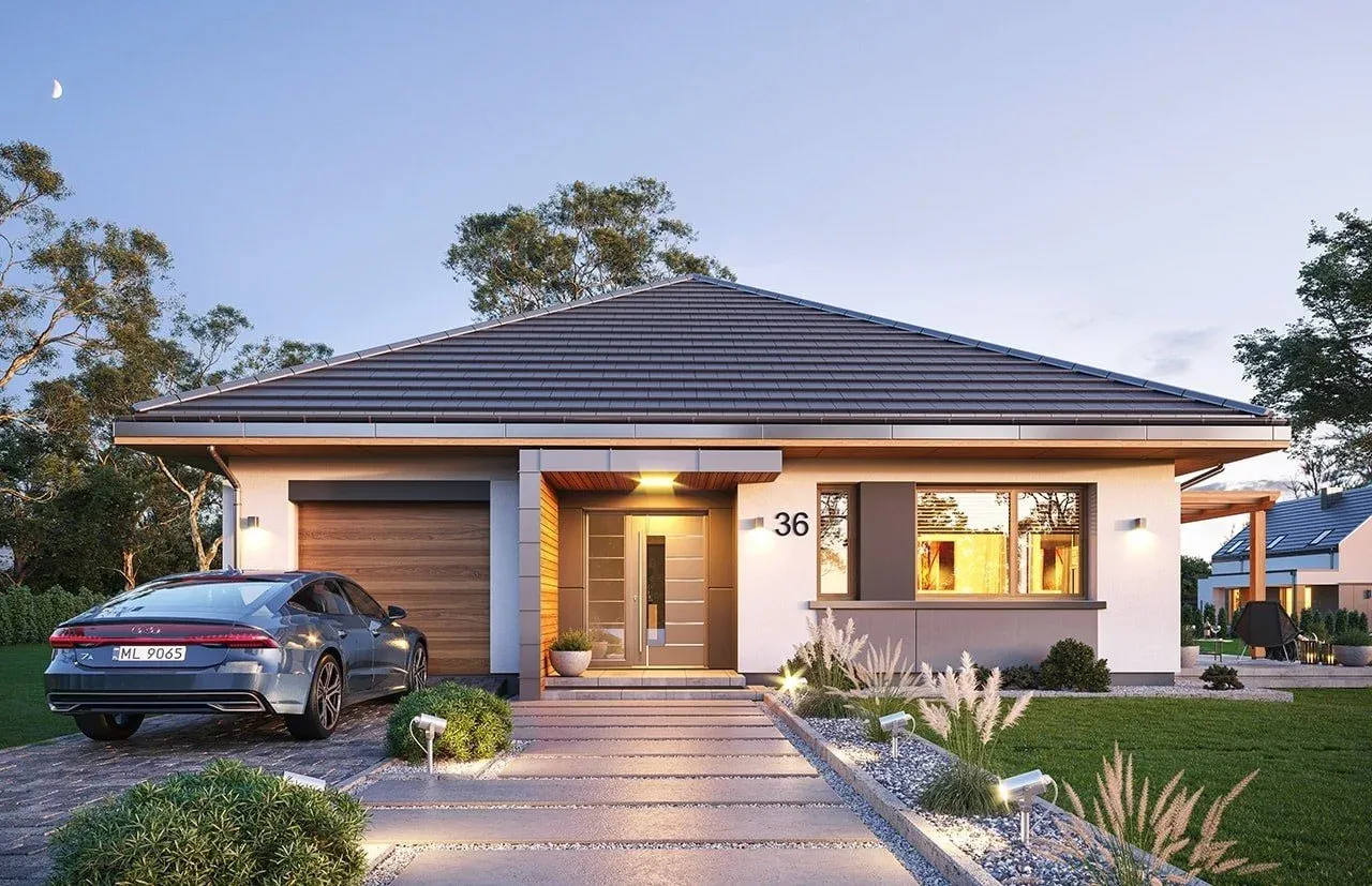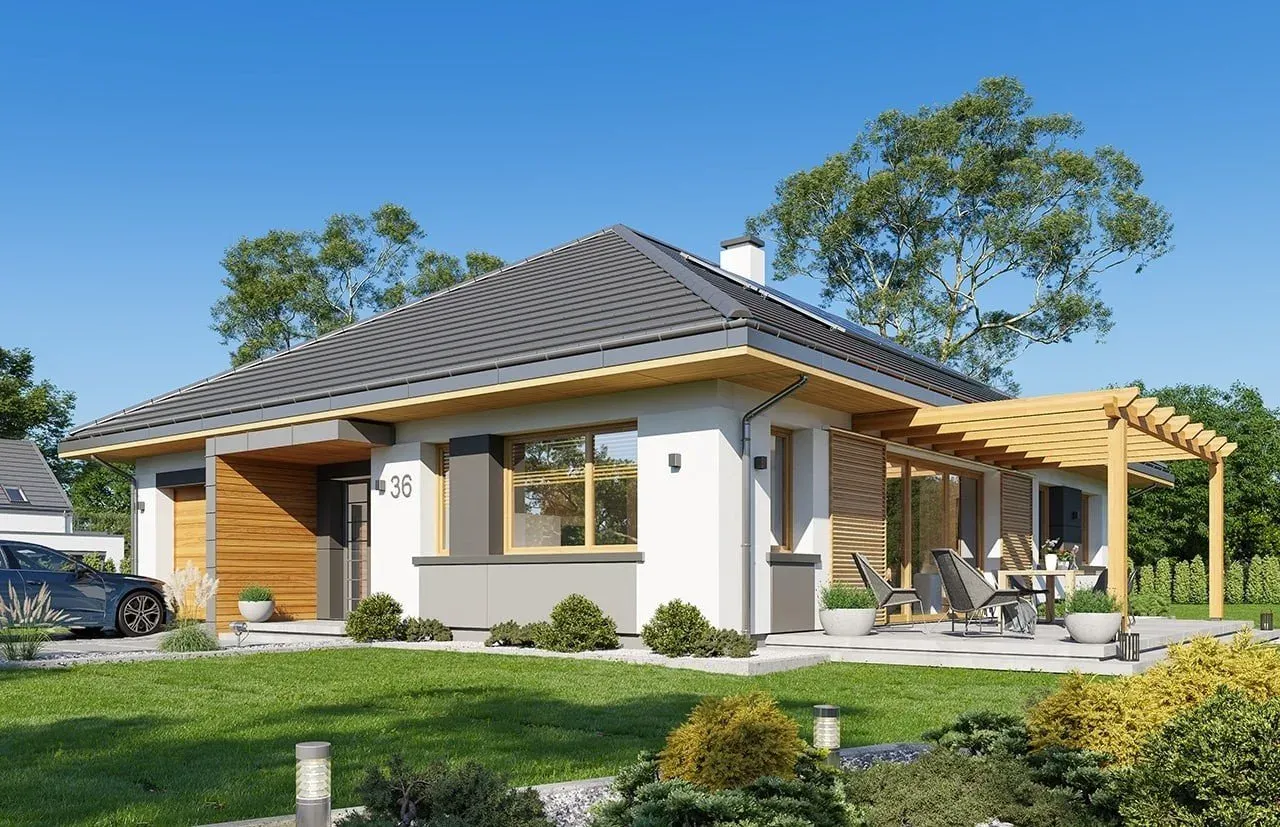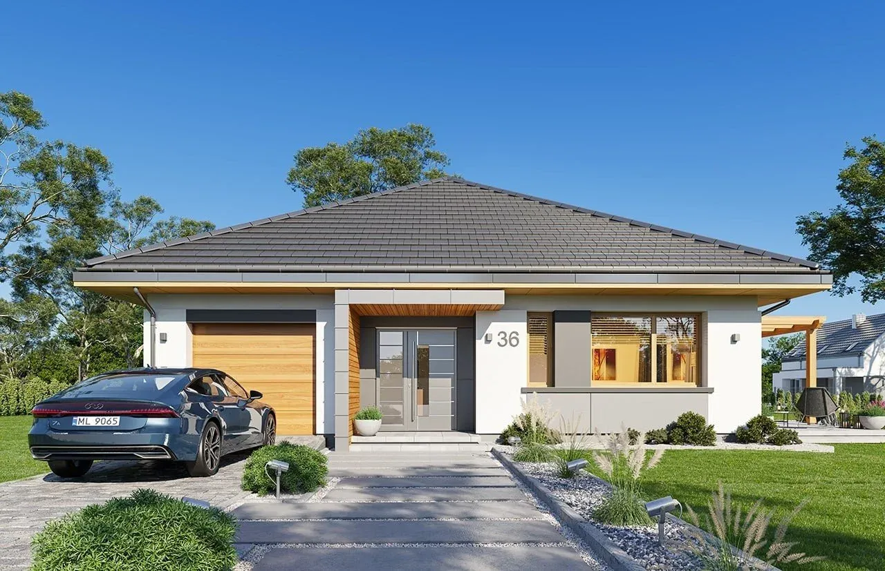 Projekt ten wyróżnia się solidną konstrukcją - zastosowano betonowe ławy i ściany fundamentowe z bloczków betonowych, ściany zewnętrzne z gazobetonu oraz docieplenie styropianem. Strop oparto na prefabrykowanych wiązarach drewnianych z przestrzenią strychową, dając możliwość wygodnego przechowywania. Wielospadowy dach pokryty trwałą dachówką i tynkowana elewacja nadają budynkowi nowoczesny, schludny charakter.