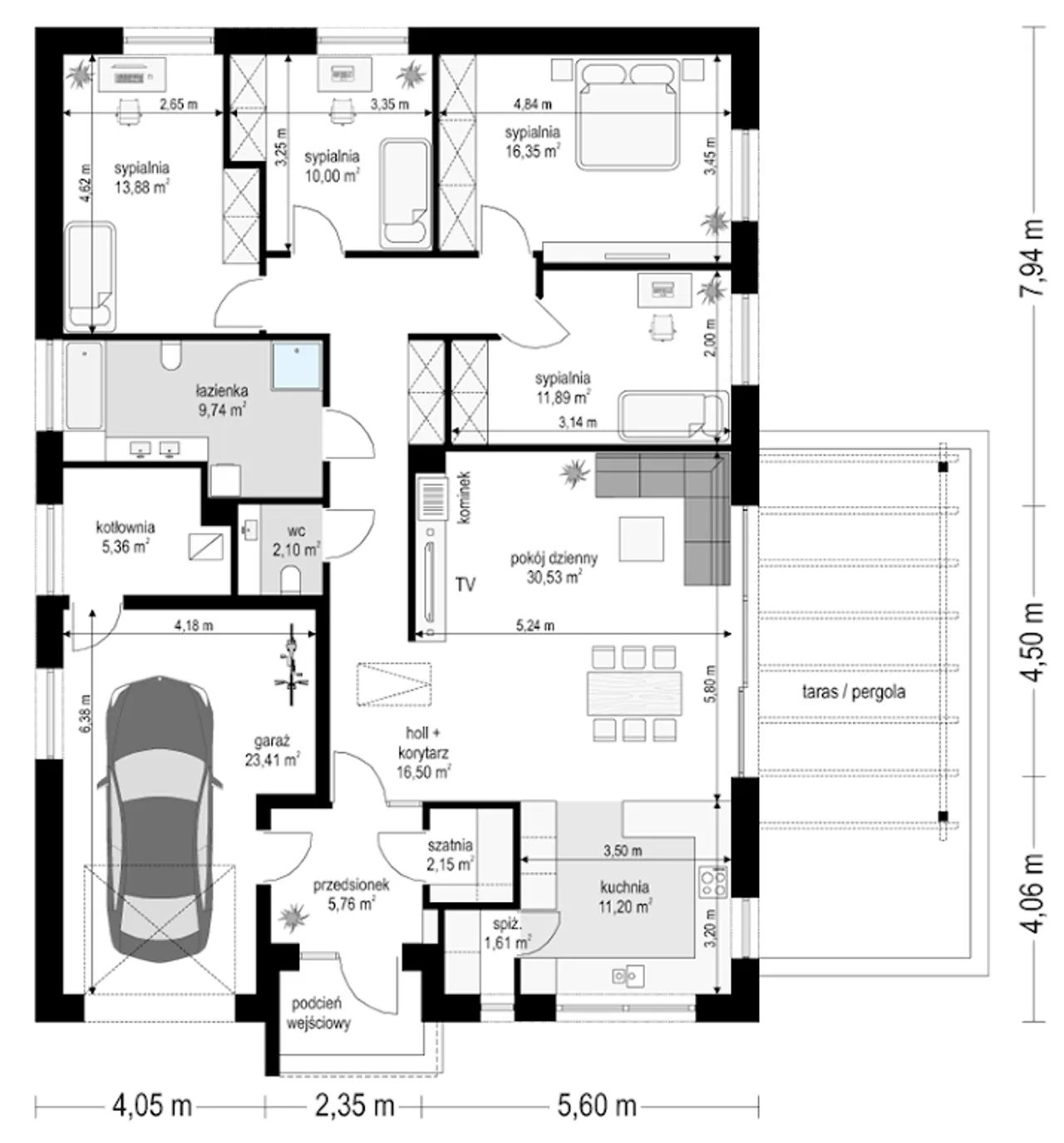 Postaw na pewną inwestycję - dom murowany z solidnymi fundametami, dachem wielospadowym i prefabrykowanym drewnianym stropem, gotowy na każdą porę roku. Pozwól, by praktyczne detale ułatwiały codzienność: kominek otuli wnętrze ciepłem, a spiżarnia pomoże zorganizować domowe zapasy.