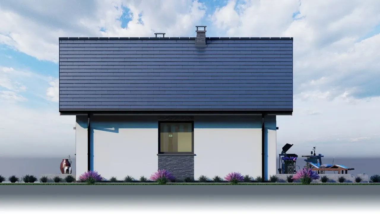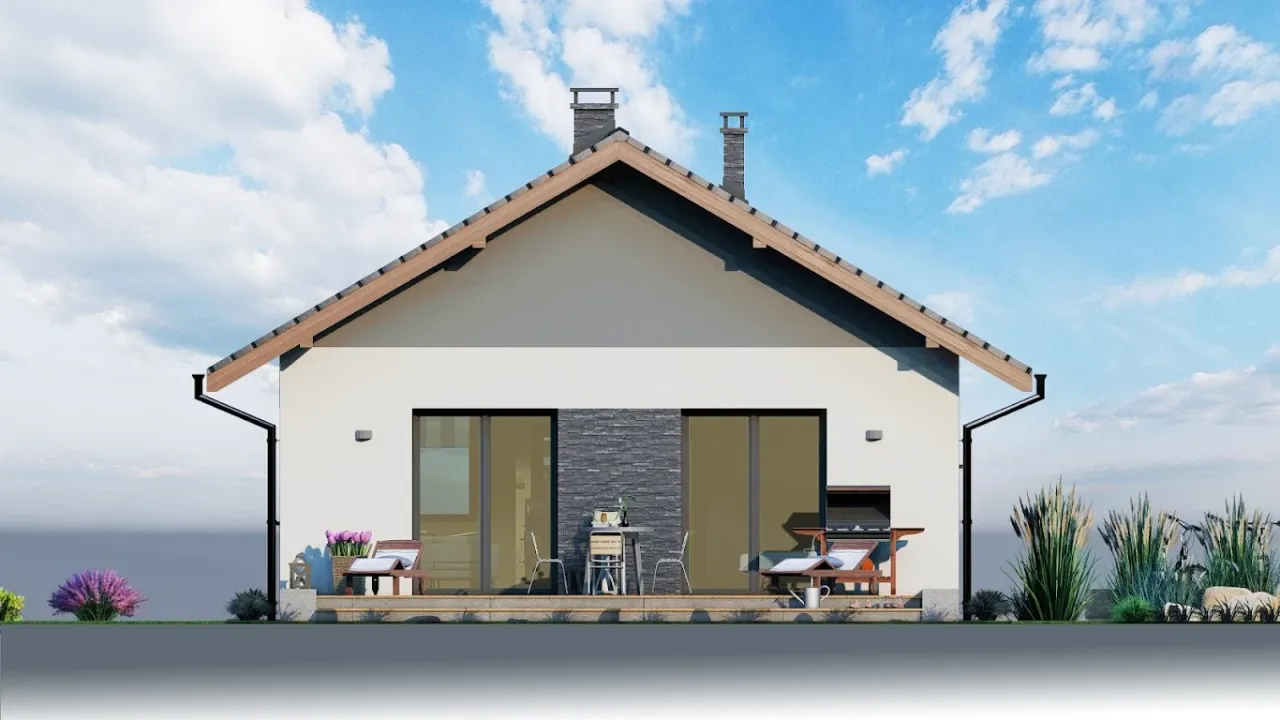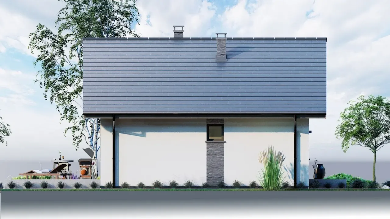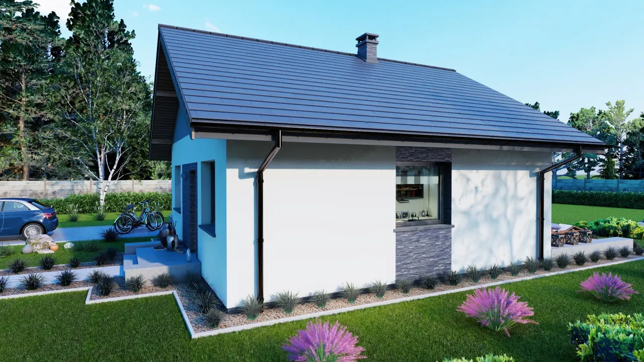 Przyglądając się projektowi domu, w oczy rzuca się nowoczesna bryła, która dobrze wpisuje się w aktualne trendy architektoniczne. Wnętrze tego domu zapewnia praktyczny rozkład pomieszczeń, co jest istotne dla rodziny. Otwarta przestrzeń części dziennej zachęca do spędzania wspólnego czasu, natomiast oddzielone sypialnie gwarantują odpowiednią prywatność. Dodatkowo taras dostępny z salonu stanowi idealne miejsce do relaksu na świeżym powietrzu. Bardzo dobrze przemyślany podział funkcji na strefy mieszkalne i gospodarcze świadczy o dbałości o codzienną wygodę mieszkańców.