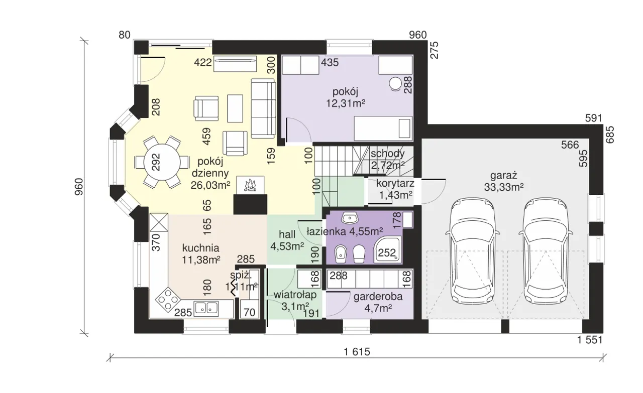 Wypełnij formularz i otrzymaj rysunki w pdf z dokładnymi wymiarami budynku i pomieszczeń (długość, szerokość, wysokość) dla projektu Dom przy Cyprysowej 15 P