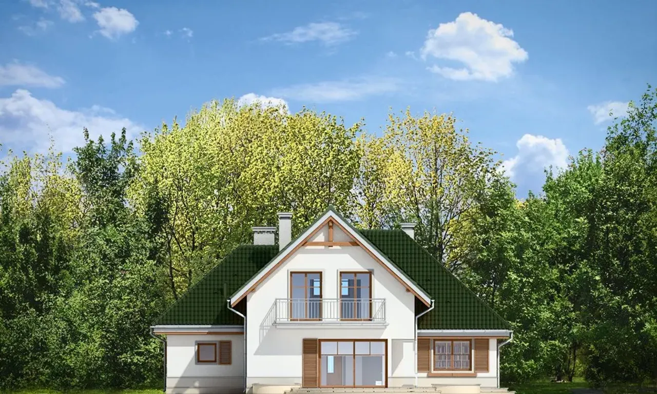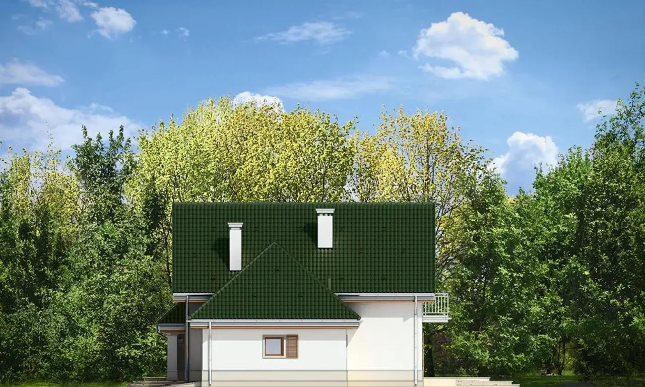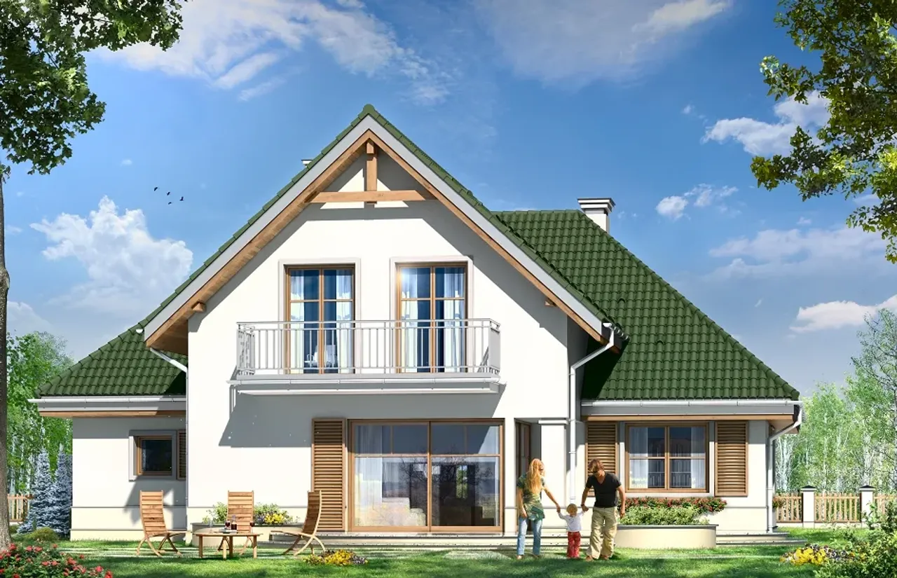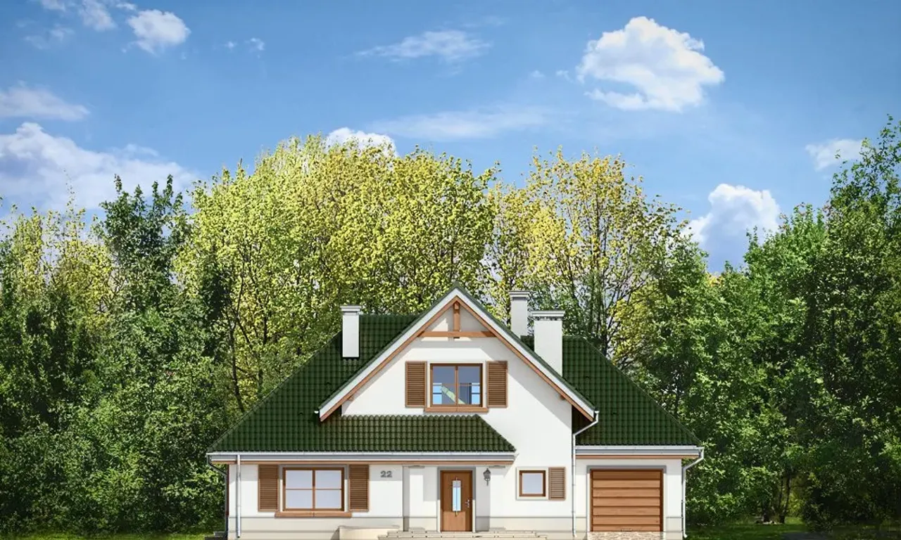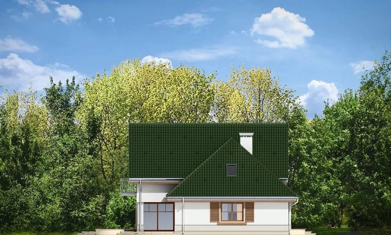 Projekt domu Dom w Brzozach to niepodpiwniczony, parterowy budynek z poddaszem użytkowym na planie litery "L" optymalny dla rodziny 4-5 osobowej. Budynek posiada jednostanowiskowy garaż. Powierzchnia użytkowa 160,09 m2. Budynek może być posadowiony na działce od 460 m2 Projekt przewiduje ogrzewanie wodne zasilane piecem gazowym zainstalowanym w kotłowni na parterze. Dodatkowo można uzyskać ogrzewanie na bazie kominka. Parter projektu Domu w Brzozach to duży salon w szczycie budynku od strony ogrodowej z kominkiem i przeszklonym wyjściem na logię przechodzącą w otwarty taras. Z boku duża jadalnia przechodząca w otwartą kuchnię. Za kuchnią osobny pokój. Po drugiej stronie znajduje się WC z natryskiem i przylegającym schowkiem. Obok schody na piętro. Piętro obejmuje sypialnię małżeńską z garderobą i łazienką oraz dwie sypialnie z wyjściem na wspólny balkon i wspólną łazienkę. Charakterystyka Energetyczna dla tego projektu jest zgodna z aktualnie obowiązującymi przepisami prawa budowlanego.