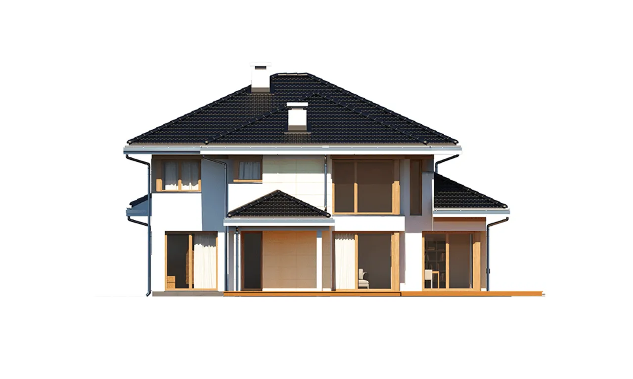 Projekt domu Dom z Widokiem 3 wariant C to stylowa willa piętrowa, wyróżniająca się prostopadłą do drogi kalenicą i efektownym wielospadowym dachem pokrytym ceramiczną dachówką. Całoroczna, murowana konstrukcja na żelbetowym monolitycznym stropie gwarantuje wysoką trwałość i bezpieczeństwo na lata. Fundamenty wykonane z betonowych ław i ścian z bloczków to stabilna podstawa pod dom rodzinny, który stanie się wizytówką inwestycji.