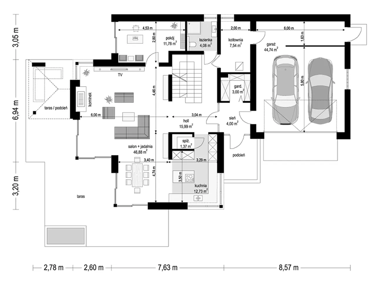 Projekt dedykowany jest rodzinom poszukującym energooszczędnych rozwiązań, przestronnych pomieszczeń oraz dużego garażu na dwa auta. Zamieszkaj stylowo, korzystaj z praktycznych funkcji i ciesz się nowatorską formą swojego domu!